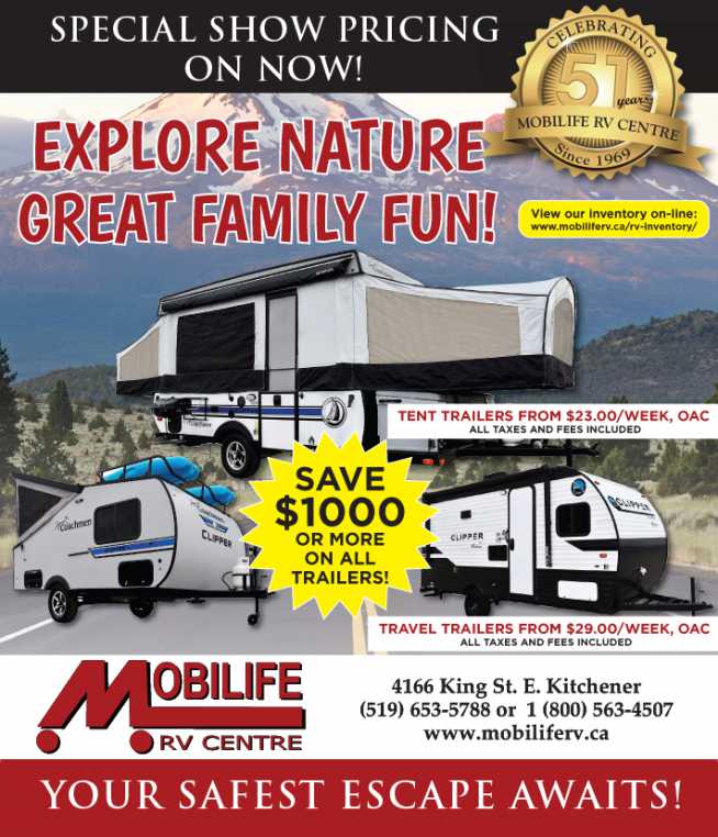 Mobilife RV Centre would like to update everyone and apologize that the Kitchener RV Show has been canceled until 2021 due to COVID-19. Given the uncertain circumstances, show pricing will be held over. Save $1000 or more off of your trailer purchase, contact us today for more information about our inventory.
