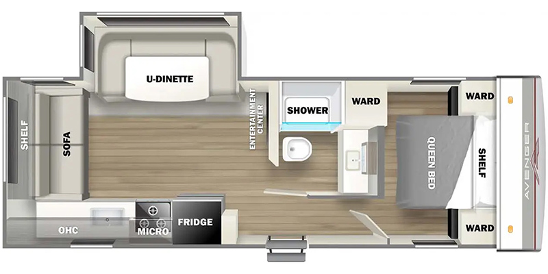 The Avenger 24RLSLE is equipped for adventure! The front bedroom features a walkaround queen bed and loads of wardrobe cabinets for storage. The central bath includes a vanity sink with countertop, shower, medicine cabinet, and commode. There's a slideout in the main living area that holds the ev...