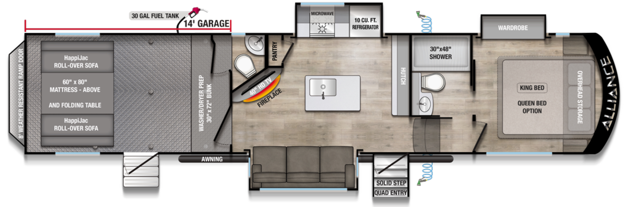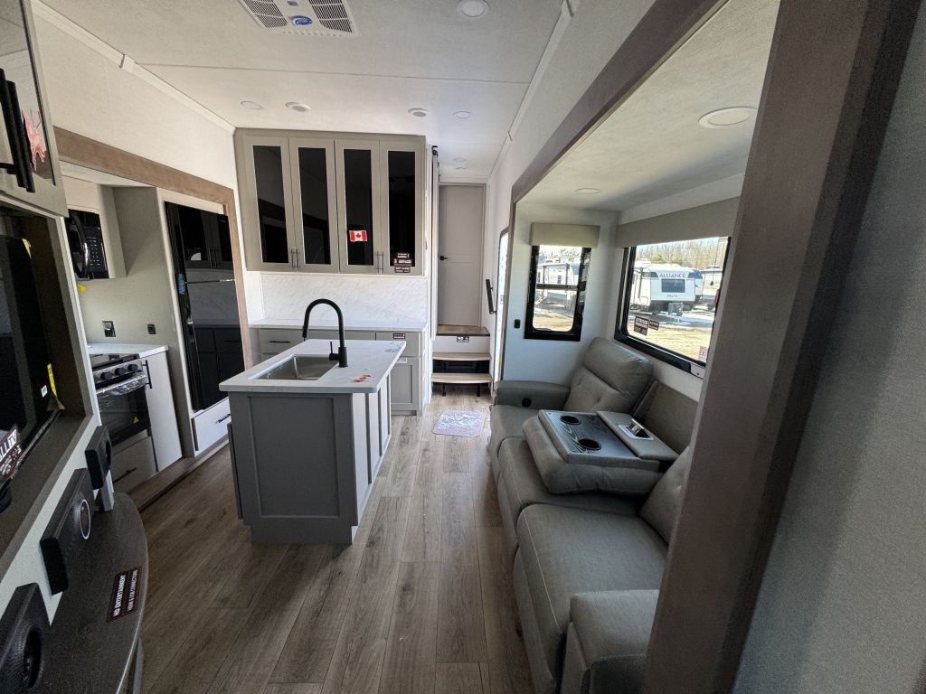 The 2026 Alliance Valor 35A14 stands out as a versatile, family-ready toy hauler that doesn’t compromise on comfort or interior quality. With its huge 14-foot garage, half bath off the garage, mid living area, residential kitchen, full bath, and private front bedroom, it’s perfect for weekend warriors and long-haul road trips alike.
