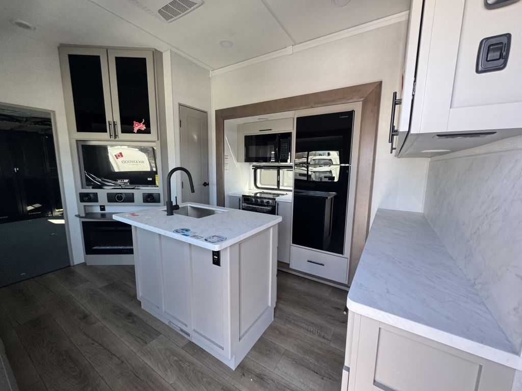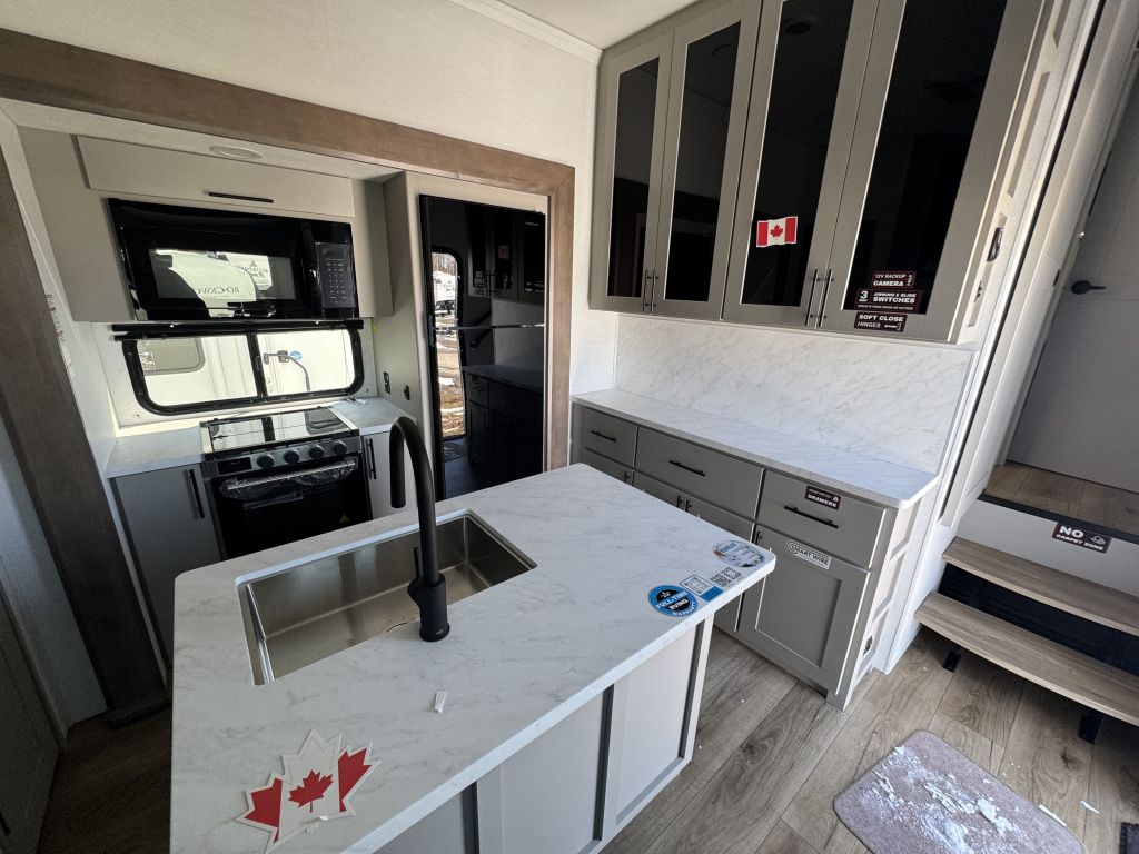 Across from the living area is a well-equipped kitchen with features you’d expect for real meal prep on the road: