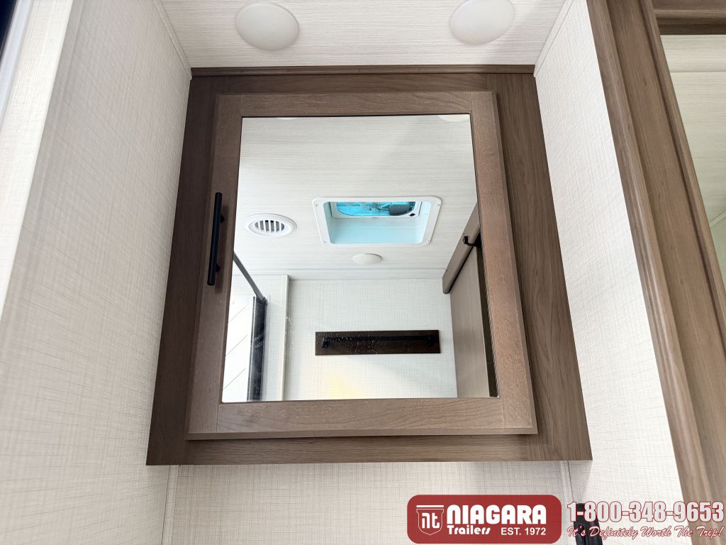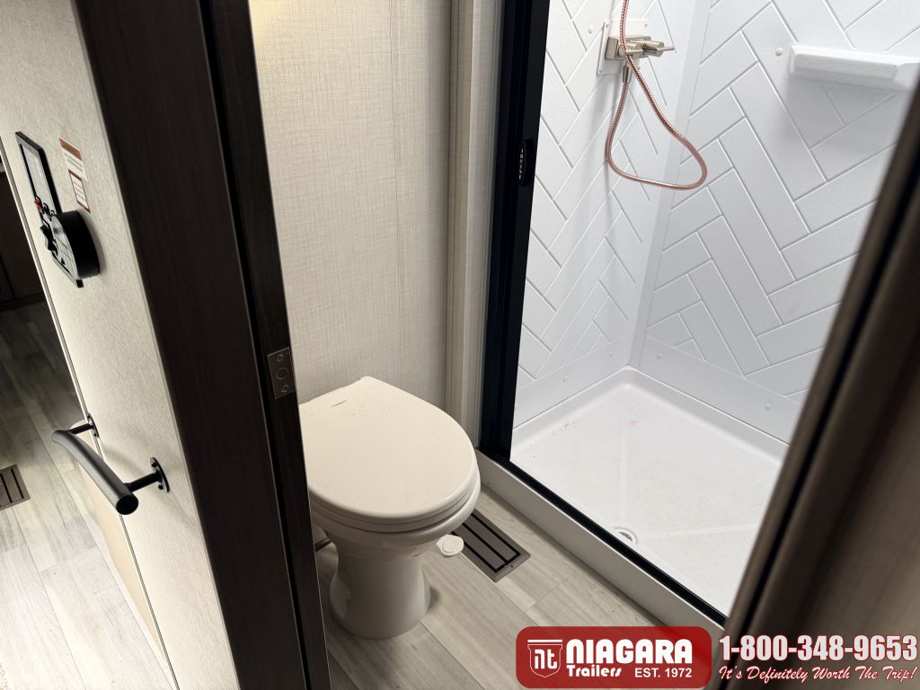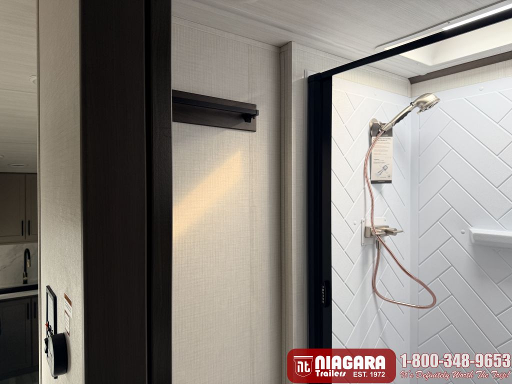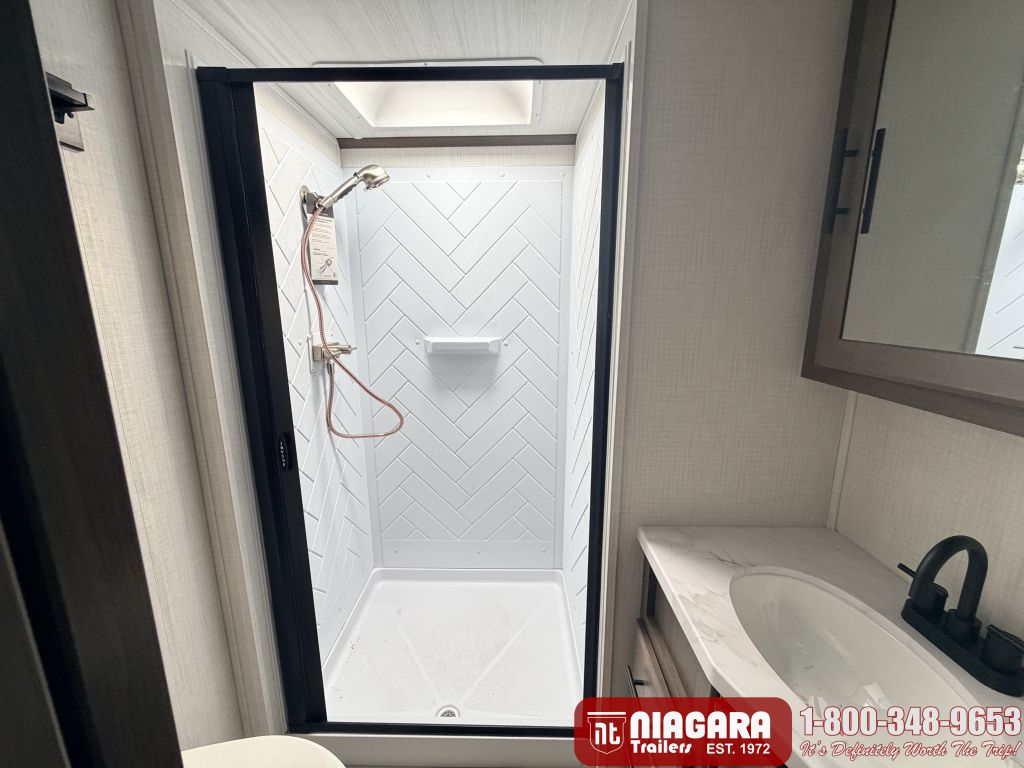 - Large shower w/ retractable shower door and skylight