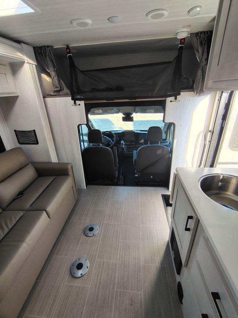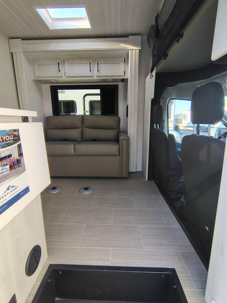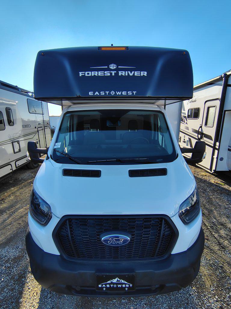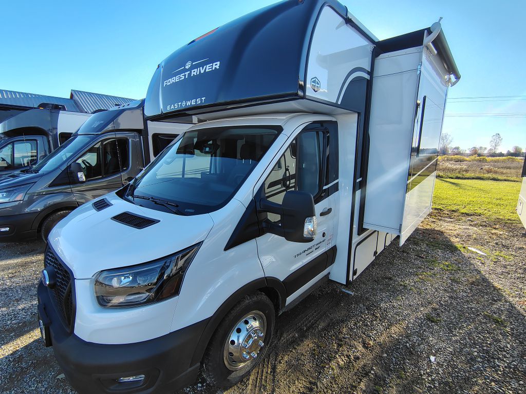 The 2026 East To West Alita 23TK is a Class C motorhome built on the Ford AWD 350 Transit chassis. It is a compact RV, measuring approximately 26 feet long, and is designed for couples or small families. A single slide-out and a cab-over bunk expand the interior living and sleeping space.
