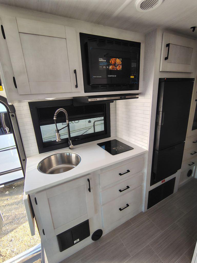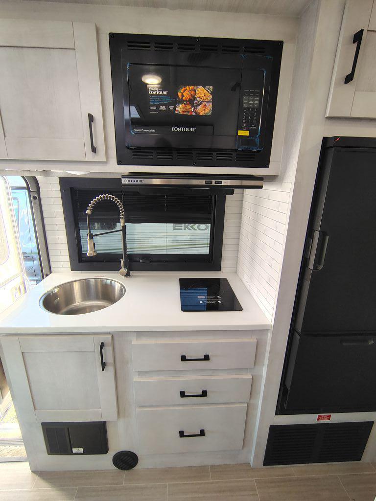 • Kitchen: Includes a 12-volt, 6-cubic-foot refrigerator, an induction cooktop, and a convection microwave. The solid-surface countertop features an extension for extra prep space.