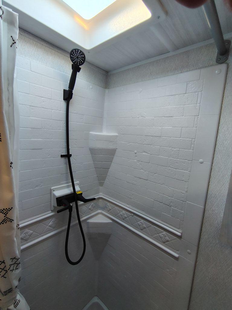 • Bathroom: A dry bath with an angled shower and a medicine cabinet. The doors open out to create a more spacious changing area.