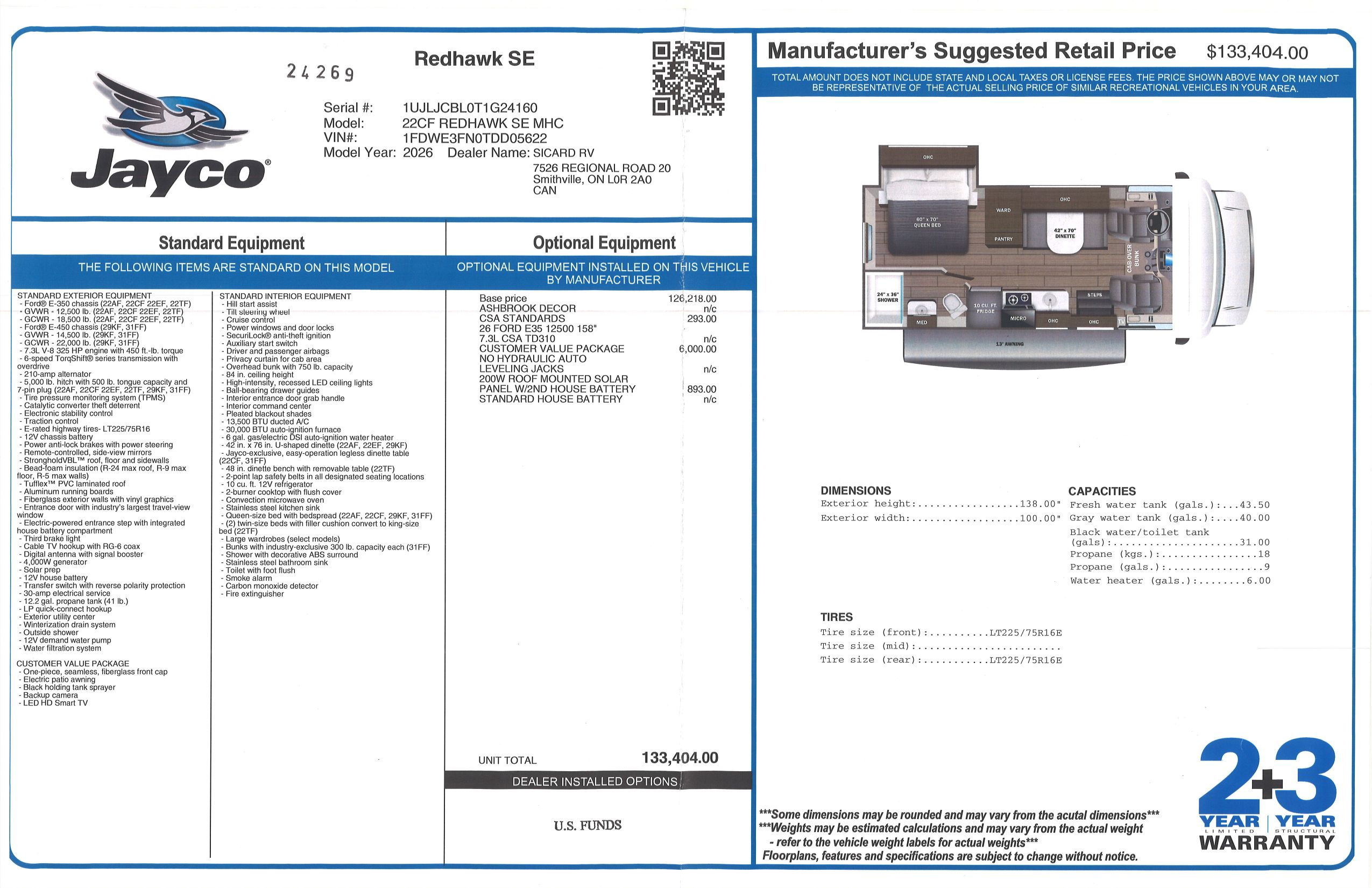 Inside this Redhawk SE 22CF you will find a cab-over bunk that provided extra sleeping spaces. Included with this Redhawk SE 22CF is the 200W solar panel with dual controller and second house battery option. All Redhawk SEs come with a 2 year limited warranty and a 3 year structural warranty, providing you with peace of mind against any defects.