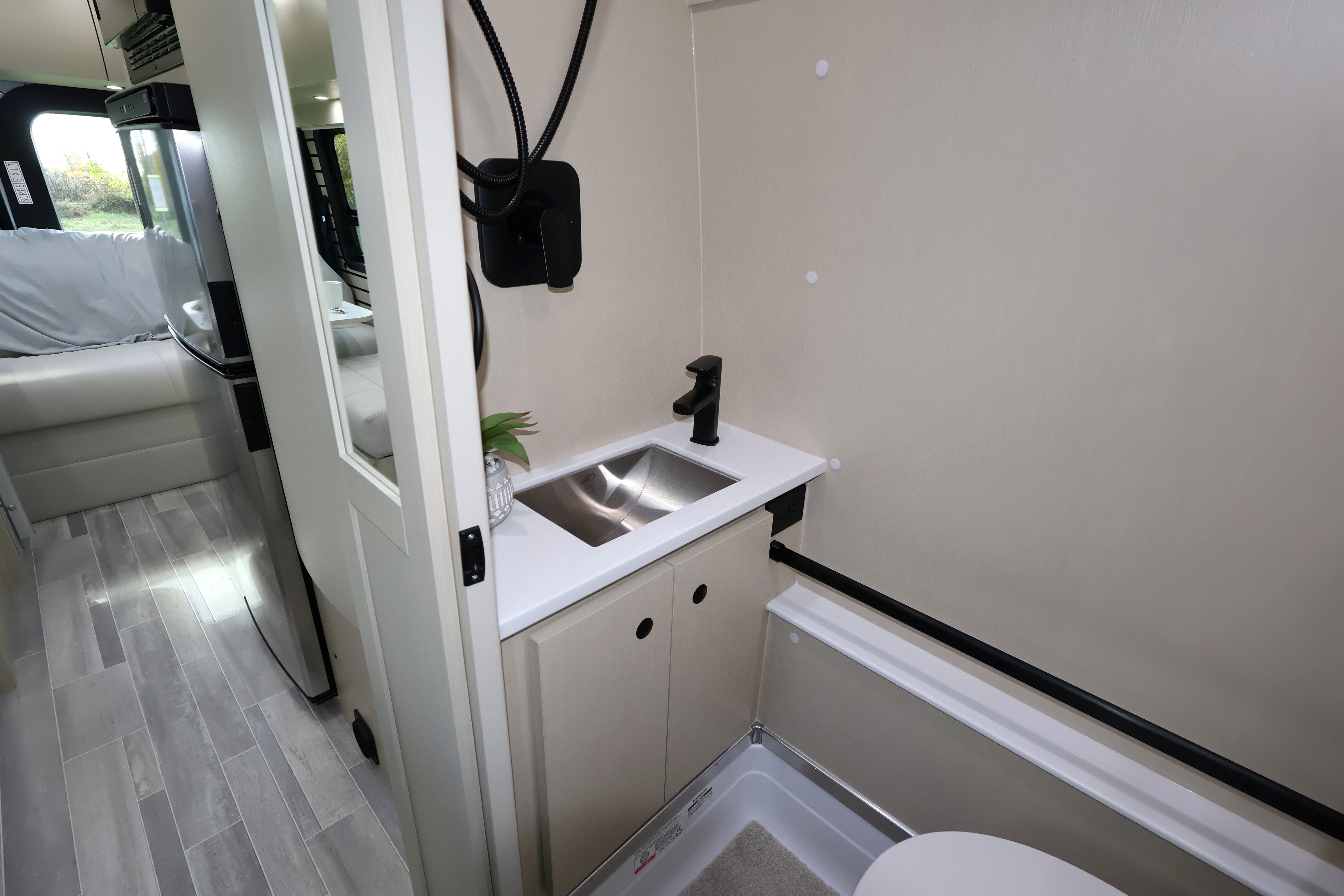 - Vanity with Corian countertop, stainless steel sink and storage