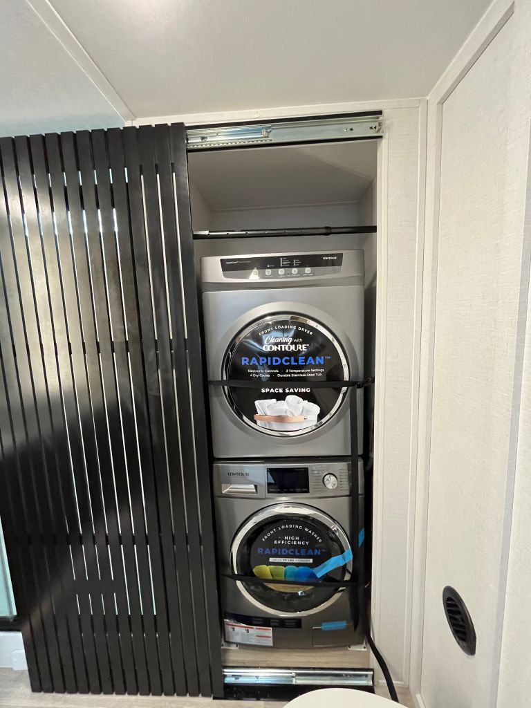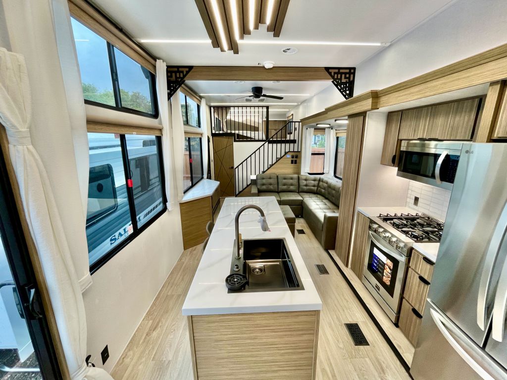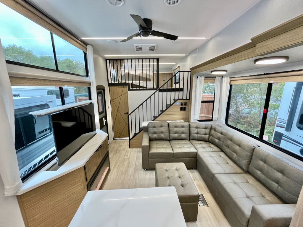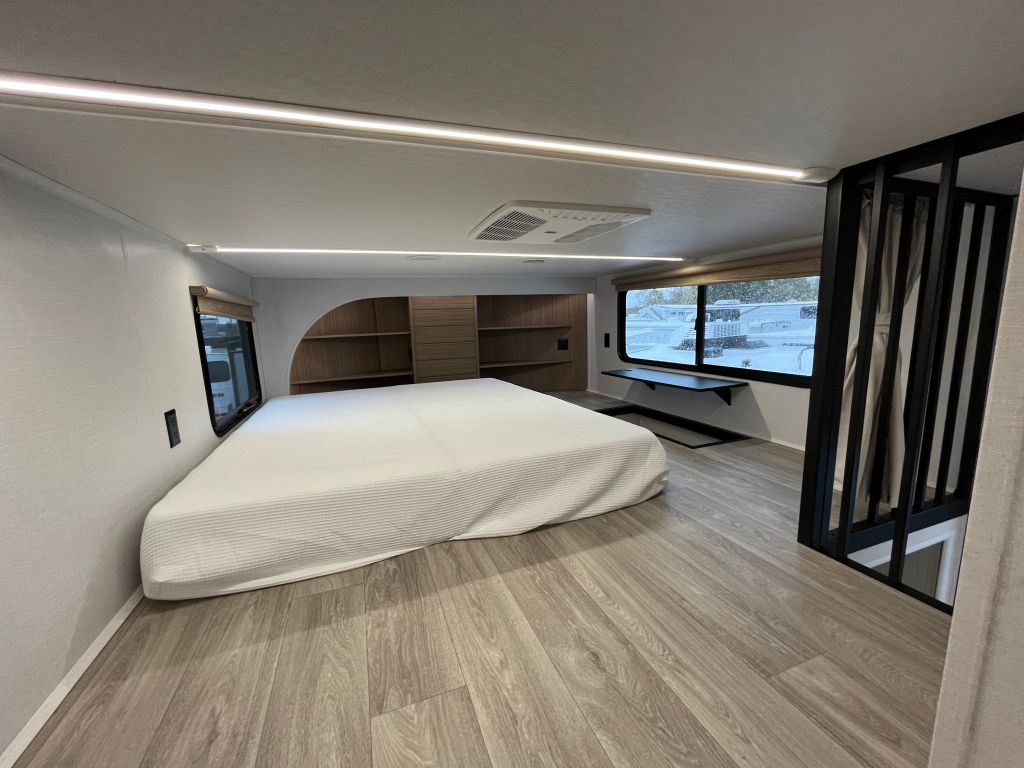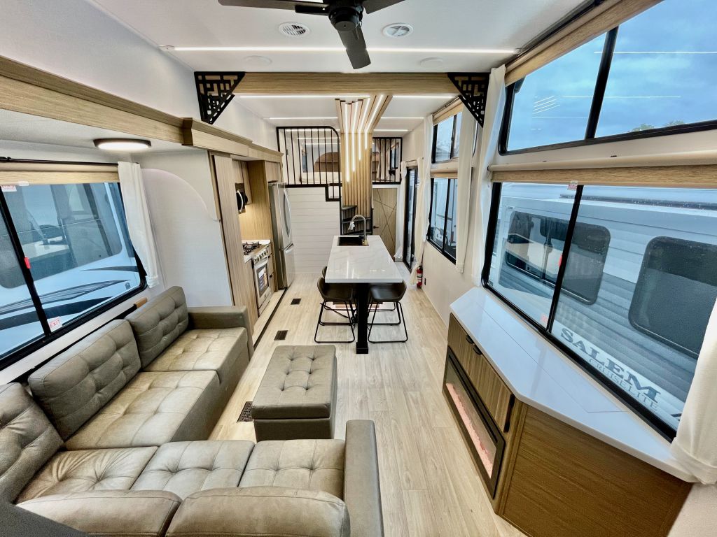 A double loft, two bathroom destination trailer that will blow you away! Double lofts, spacious kitchen/living area, large rear bathroom with washer and dryer and so much more!