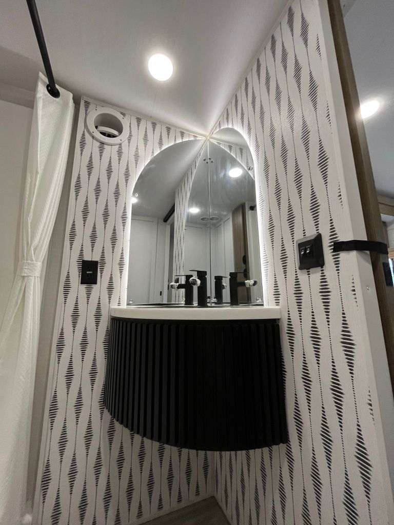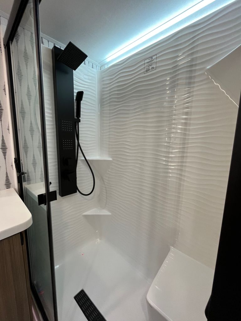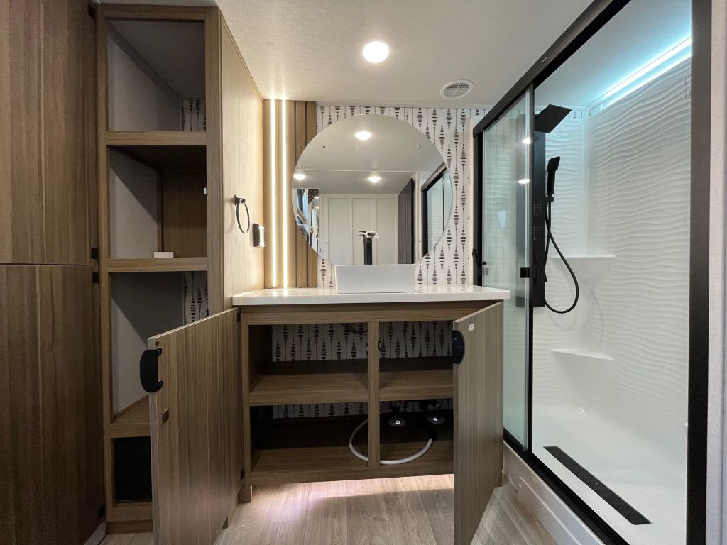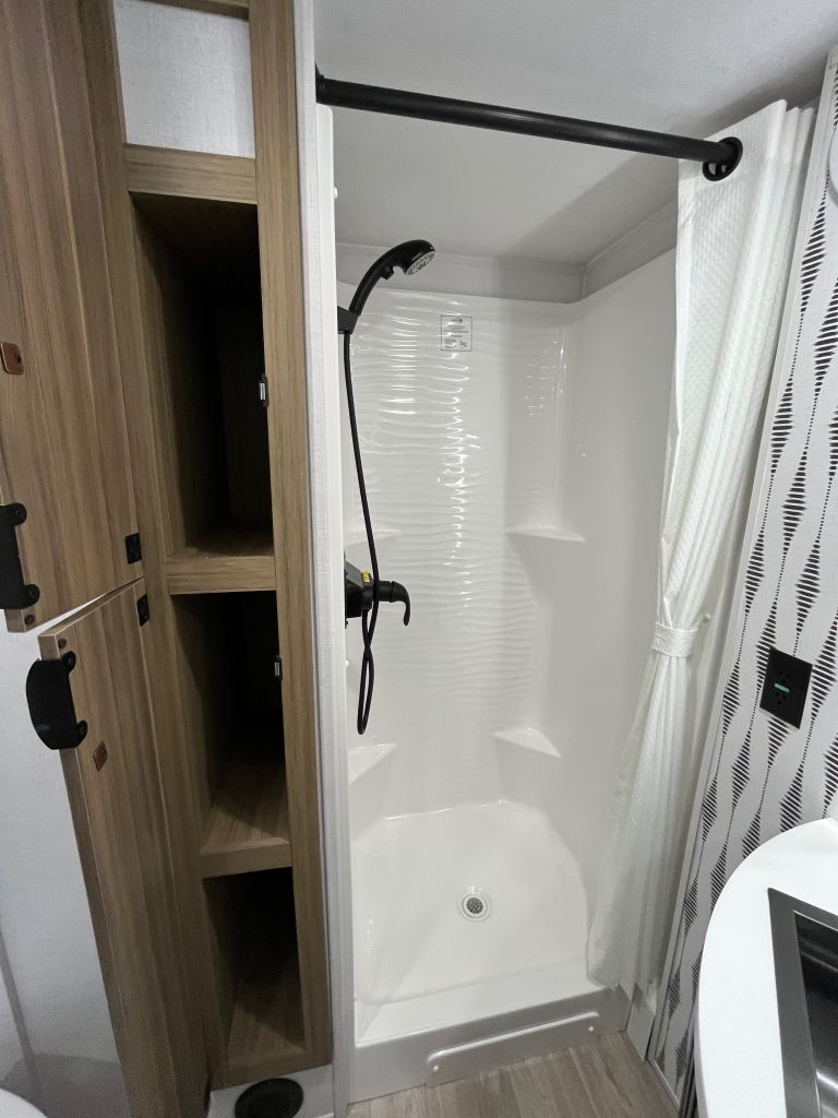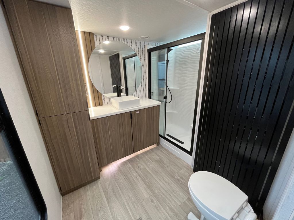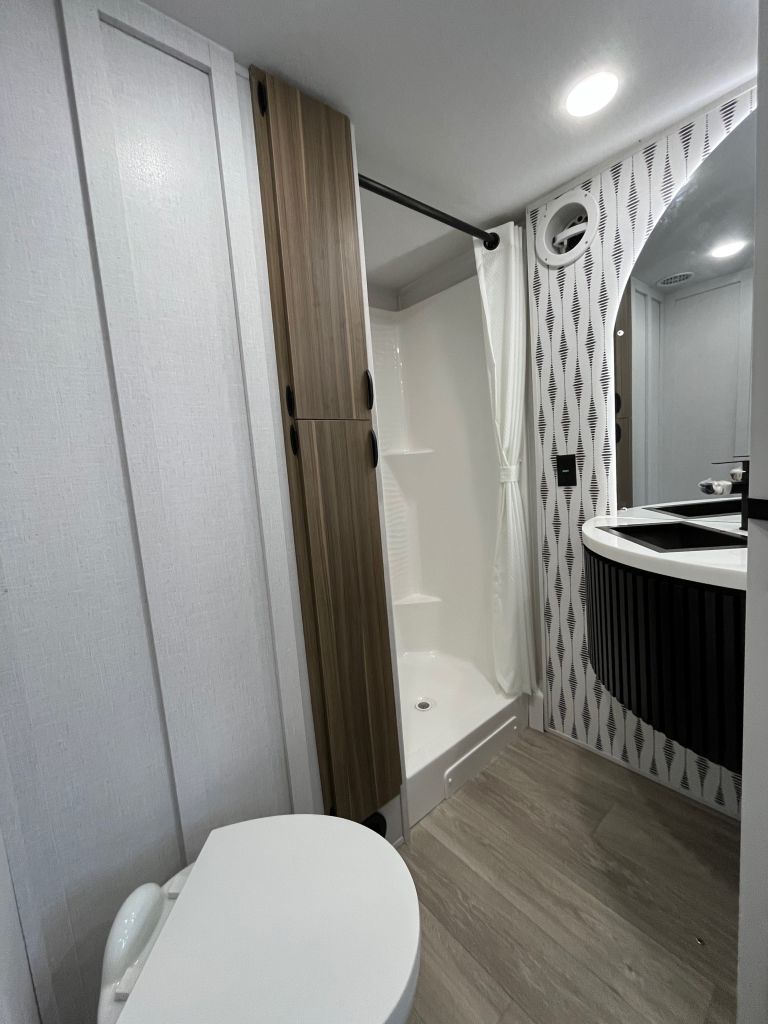 - Rear bathroom with shower, toilet, and vanity and lots of storage