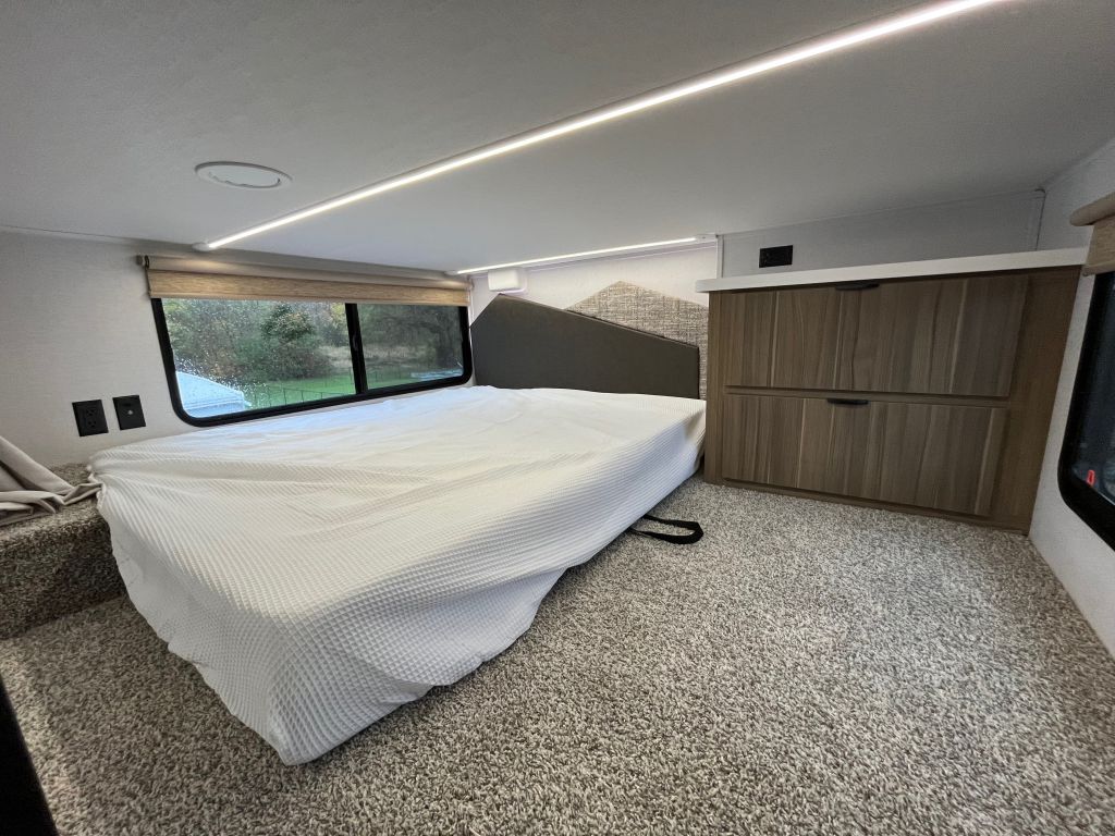 - Sleeps up to 8- front custom king bed, loft with 2 beds, 2 separate lofts with queen size mattress on each side , and pull out couch that folds out to a bed