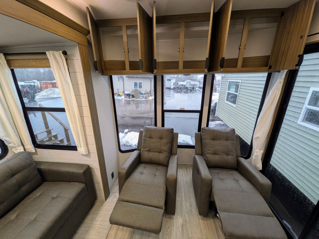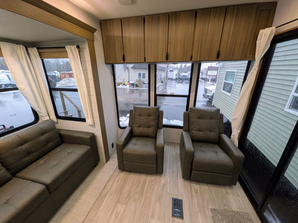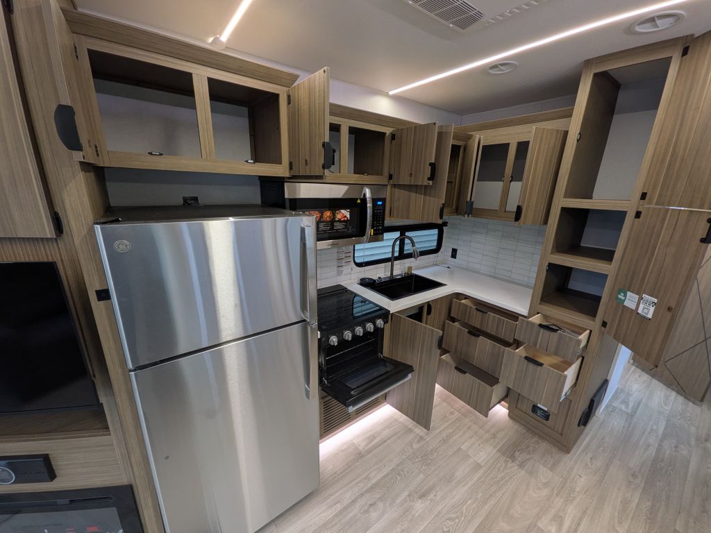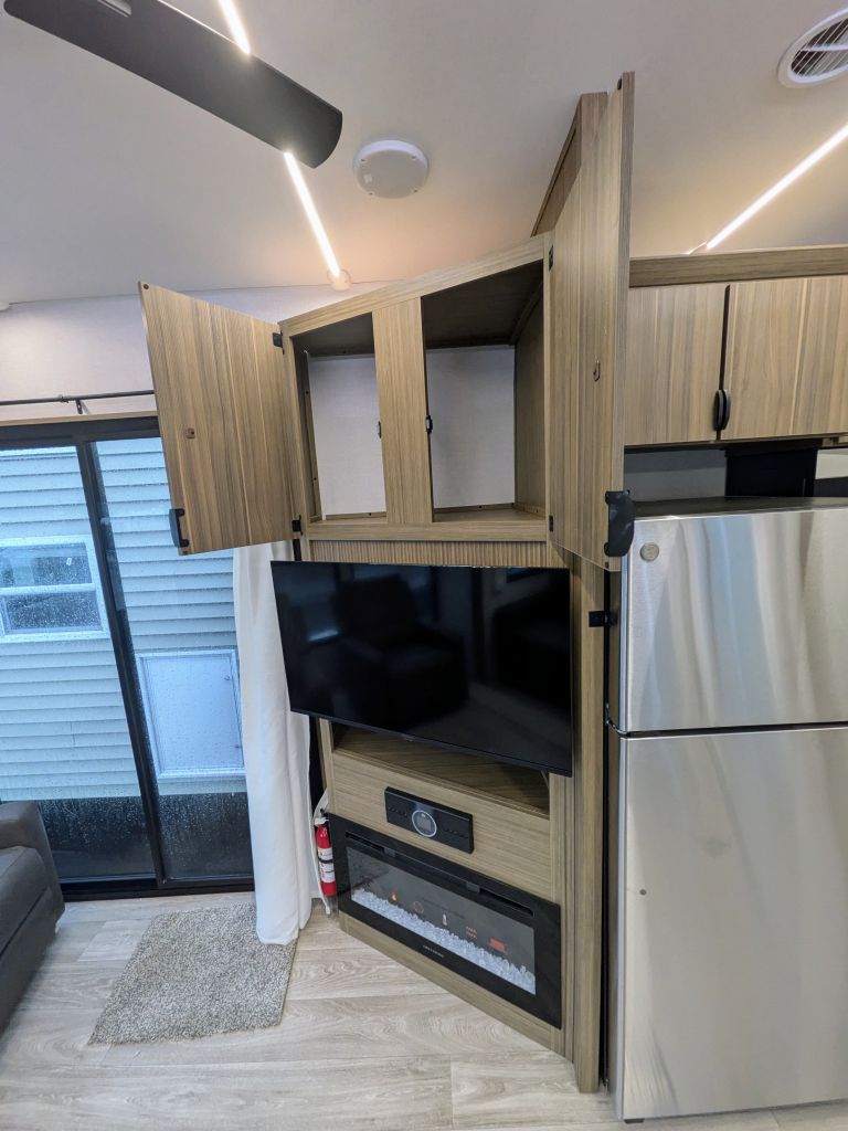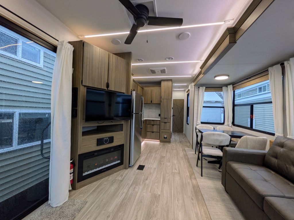 - Best In Class Value Package: Versa-Tilt Bed, Upgraded Designer Furniture Package, Exterior LED Light Strip Under Awning, Heated & Enclosed Accessi-Belly (w/ Removable Panels), LED Interior Mushroom Style Bright Lights, Central Vacuum w/ Sweep Attachment , Seamless Countertops (No T-Mold), Modern Cloth Roller Shades w/ AutoStop, Recessed Stove w/ Glass Stove Cover, Stainless Steel Kitchen Appliances, 1.6 CU FT Oversized Residential Whirlpool Microwave, Black Basin Undermount Sink, LED Accent Light PKG: Under Cabinets and Over LR Slides, Stainless Steel Roll Up Sink Cover , 30” Built-In Electrical Fireplace (Heater), VersaBed adjustable Bed