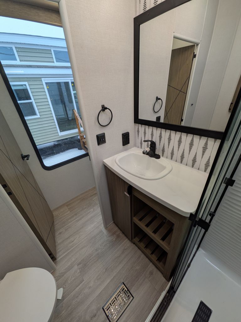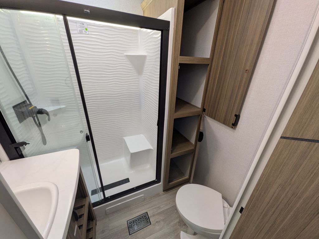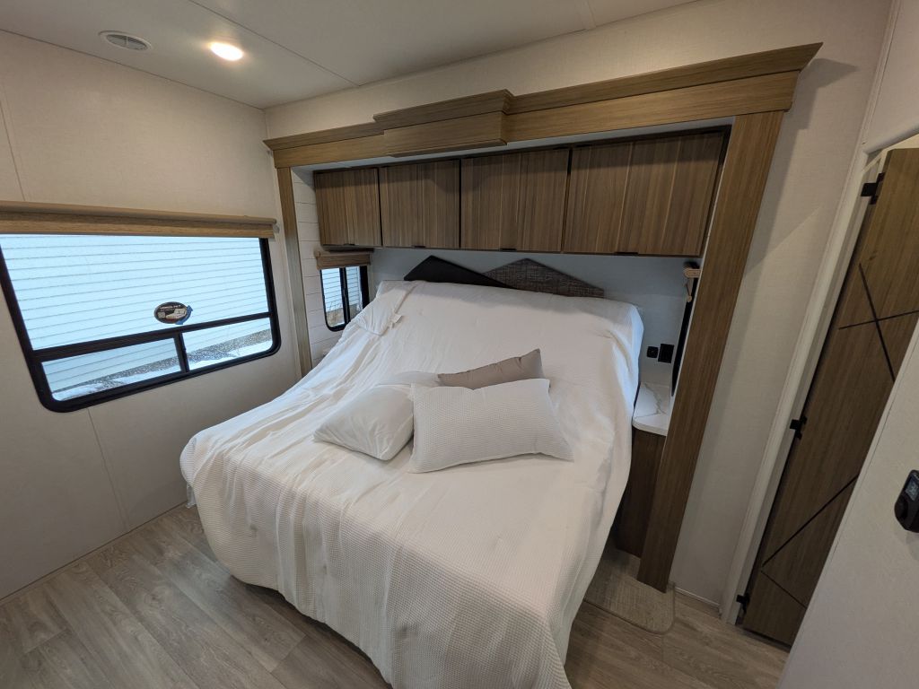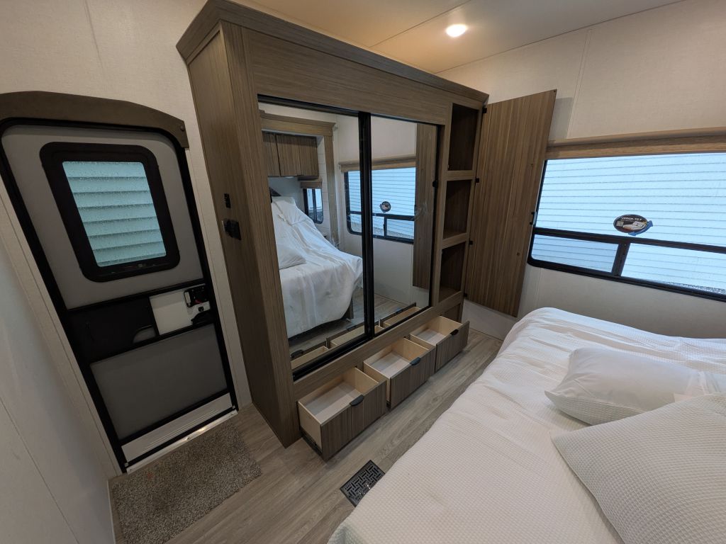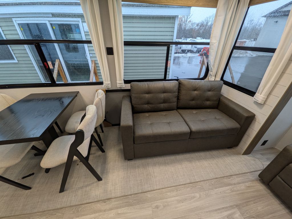 - Best In Class Value Package: Versa-Tilt Bed, Upgraded Designer Furniture Package, Exterior LED Light Strip Under Awning, Heated & Enclosed Accessi-Belly (w/ Removable Panels), LED Interior Mushroom Style Bright Lights, Central Vacuum w/ Sweep Attachment , Seamless Countertops (No T-Mold), Modern Cloth Roller Shades w/ AutoStop, Recessed Stove w/ Glass Stove Cover, Stainless Steel Kitchen Appliances, 1.6 CU FT Oversized Residential Whirlpool Microwave, Black Basin Undermount Sink, LED Accent Light PKG: Under Cabinets and Over LR Slides, Stainless Steel Roll Up Sink Cover , 30” Built-In Electrical Fireplace (Heater), VersaBed adjustable Bed