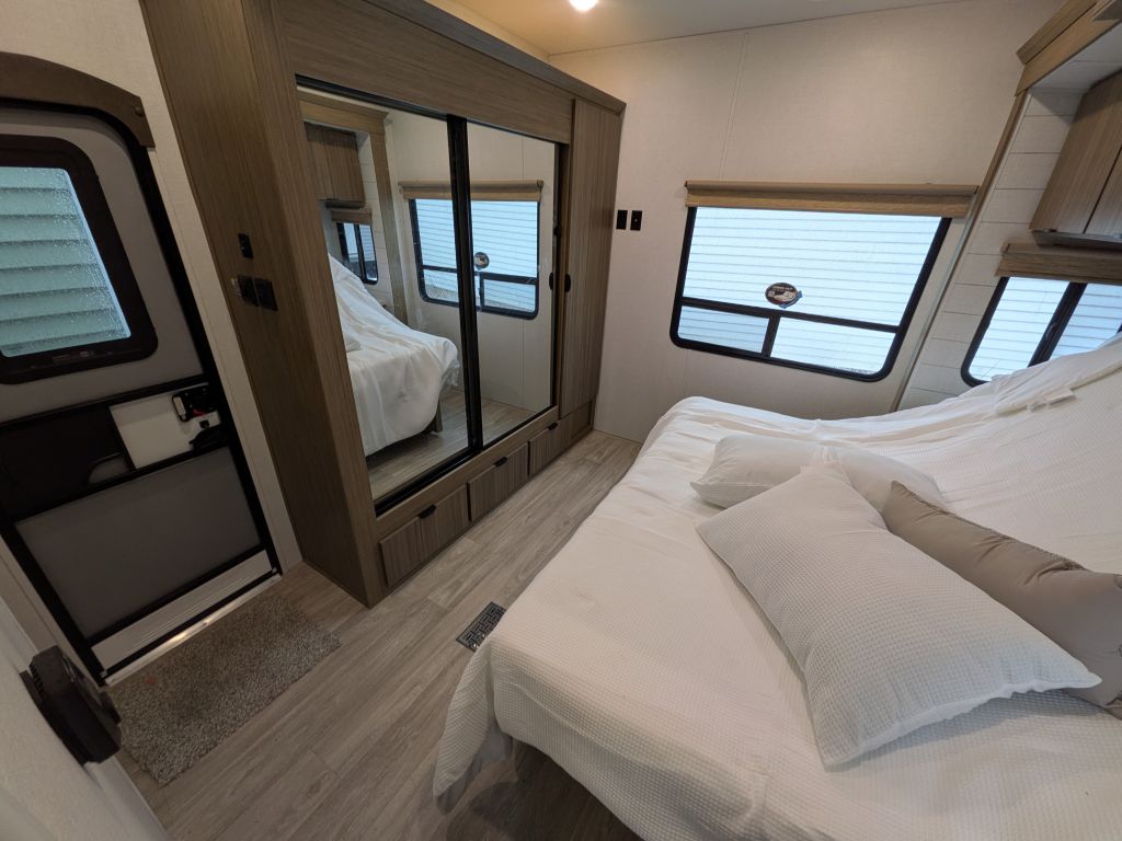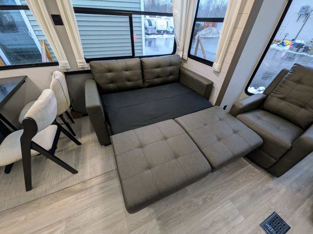 - Sleeps up to 4- rear king bed and a trifold sofa that folds down to a bed