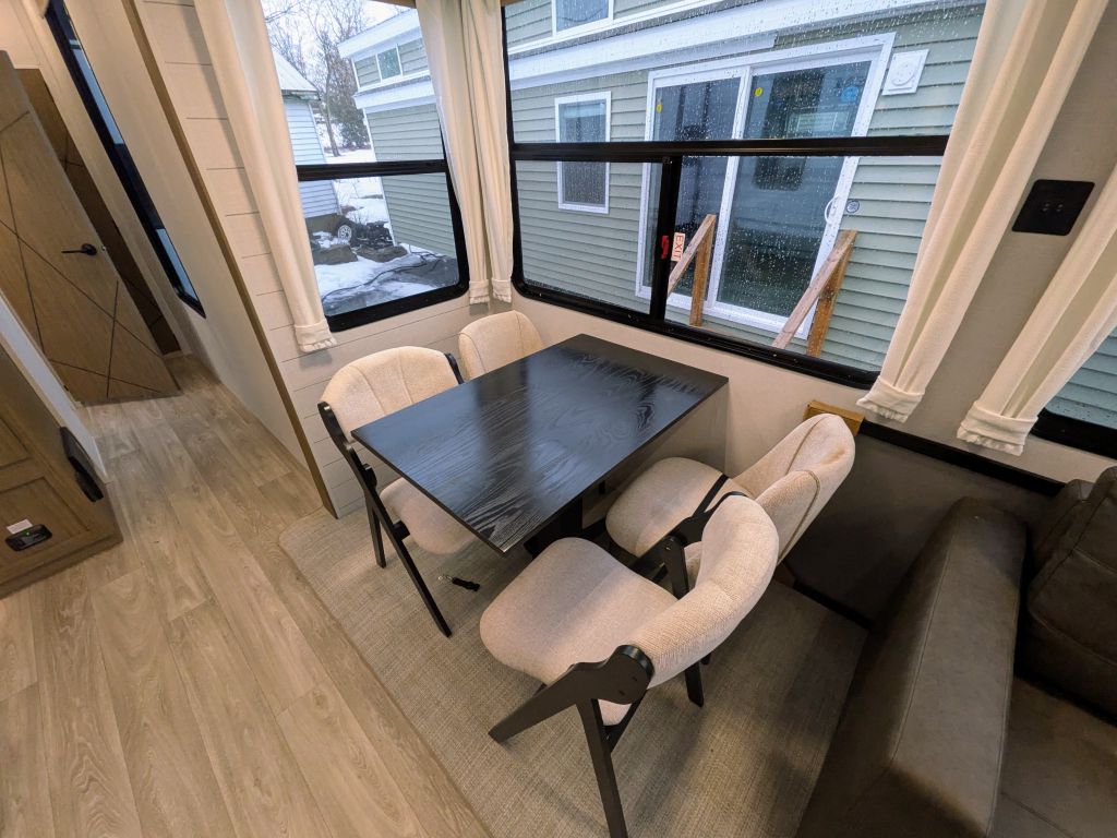 - Living space with trifold sofa, two recliners, free-standing table with four chairs, and entertainment center with fireplace