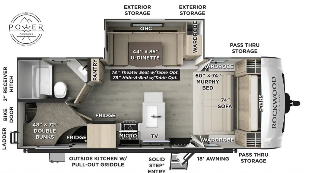 The Rockwood Mini Lite 2509S delivers one of the most flexible layouts in the lightweight trailer market. With a Murphy bed, big slide-out, spacious dinette, double bunks, and an outside kitchen, it’s a fantastic option for families or couples who want maximum sleeping room without jumping into a big travel trailer.