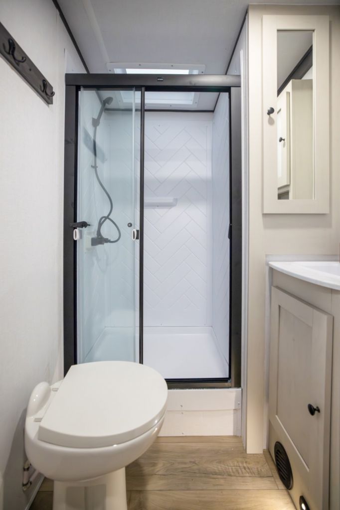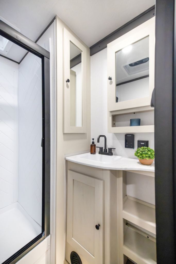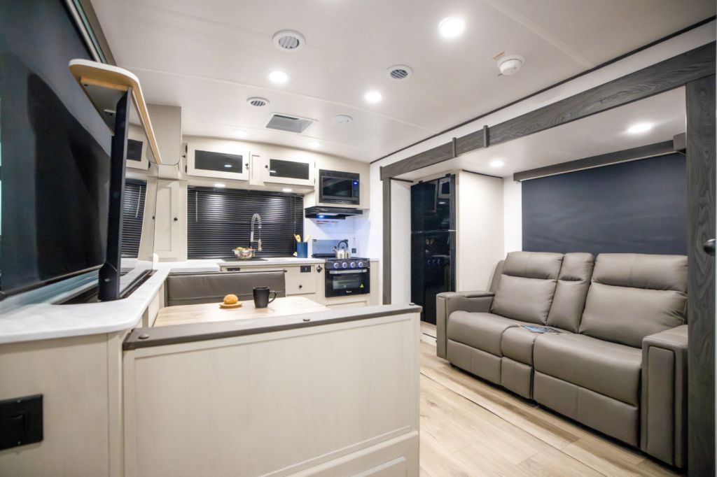 With the rear-kitchen layout, you get generous counter space, a full-height pantry, and storage that supports longer stays without constant resupply. The living area, with its slide-out, roomy seating, and large sofa or dinette makes relaxing, dining, or entertaining easy. A TV on a lift adds entertainment without clutter.