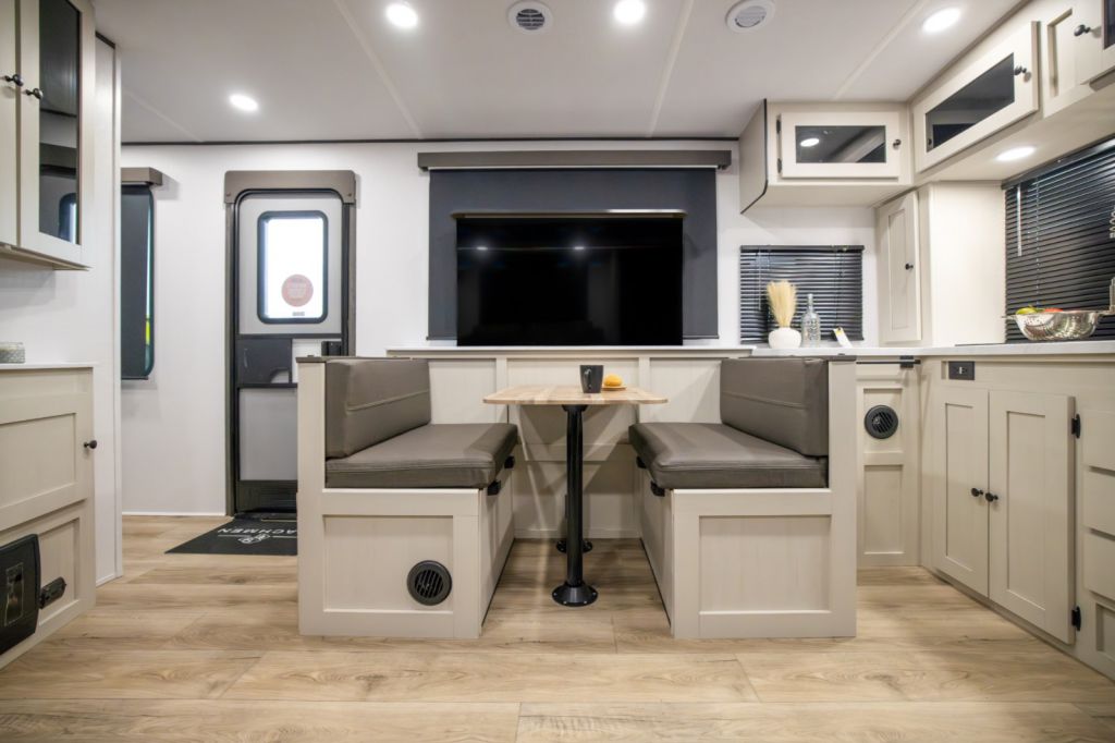 Ample living and sleeping space with a 60" × 80" queen bed, sleeper-capable furniture, and a booth dinette layout — ideal for comfortable nights and flexible use of the living area.