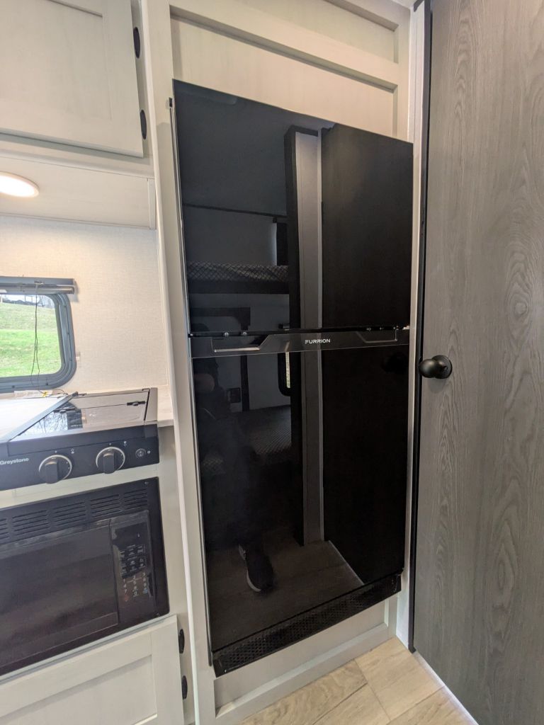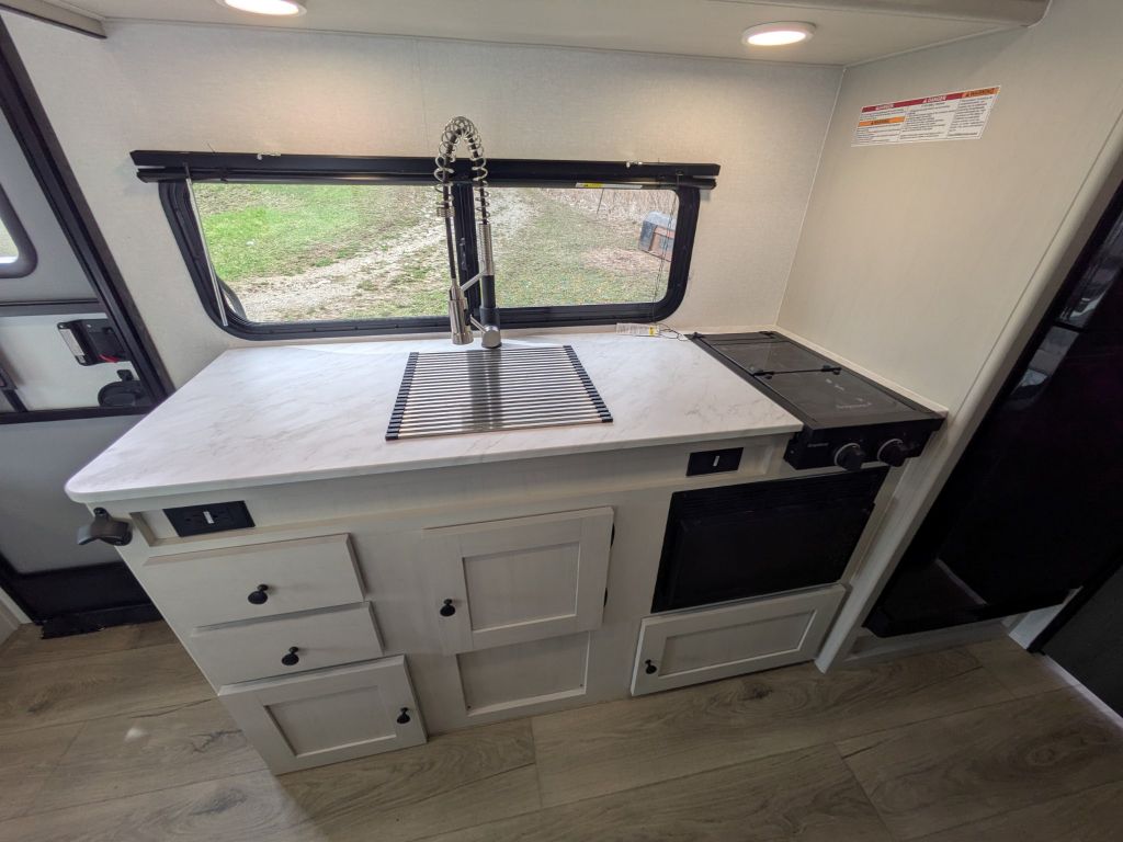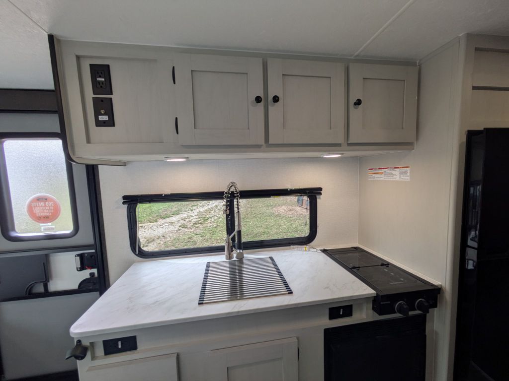 The interior is designed for modern camping comfort with a well-appointed kitchen that includes a double-door refrigerator, two-burner cooktop, microwave and seamless Thermofoil countertops. Whether you’re whipping up breakfast before a day of hiking or reheating leftovers after an afternoon of fishing, this kitchen gives you the space and functionality you need. Throughout the interior you’ll find practical amenities like USB charging outlets, LED lighting and TV prep so you can tailor your entertainment setup to your preferences.