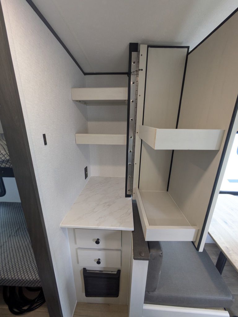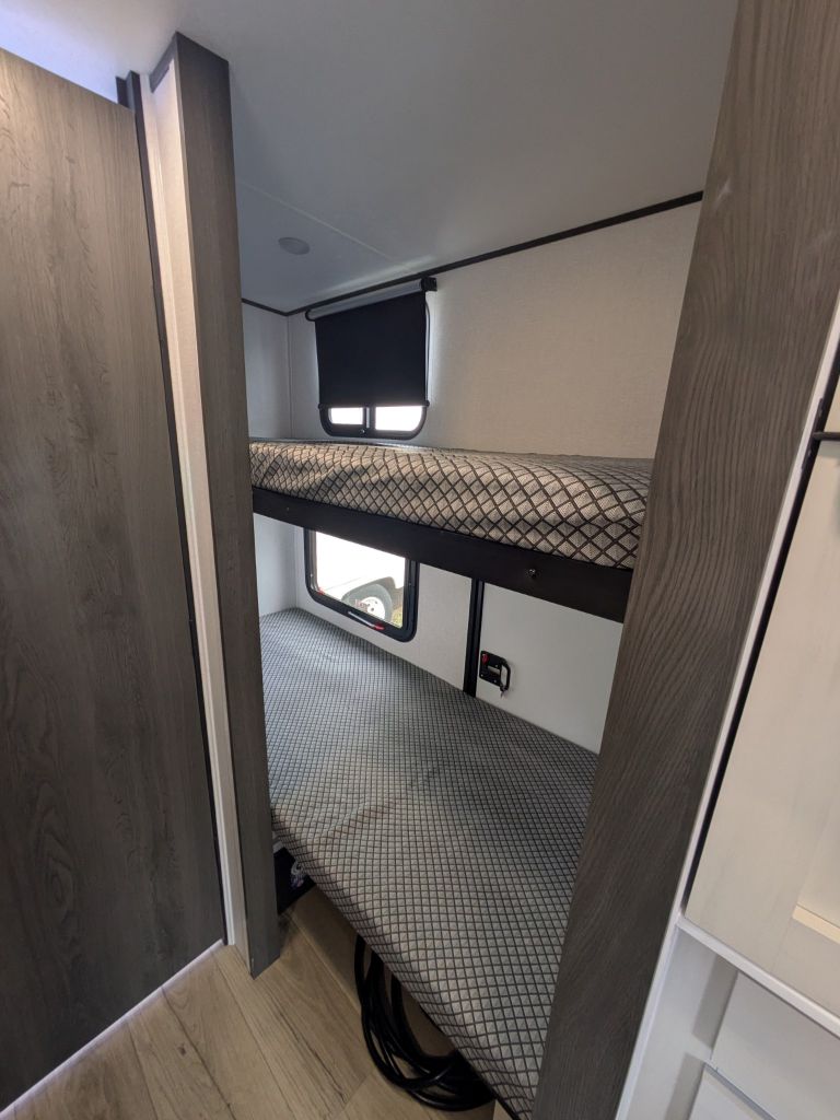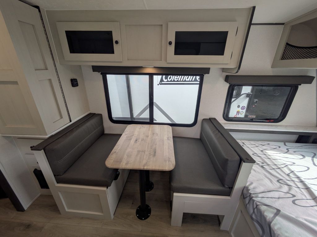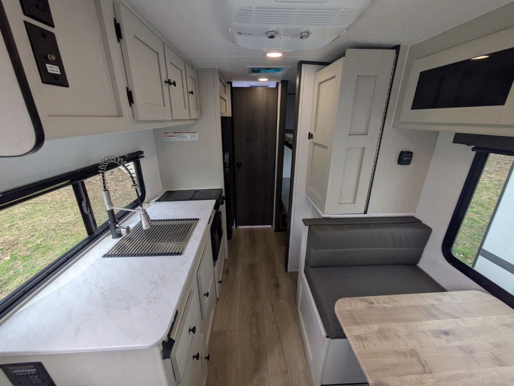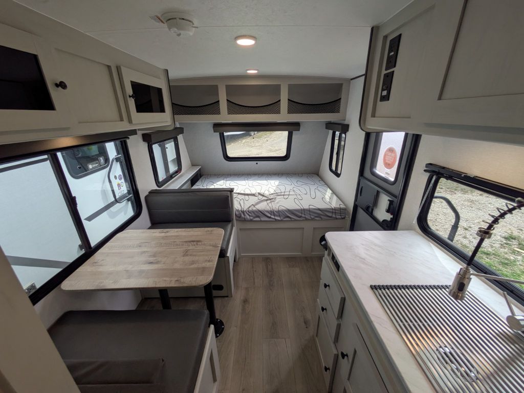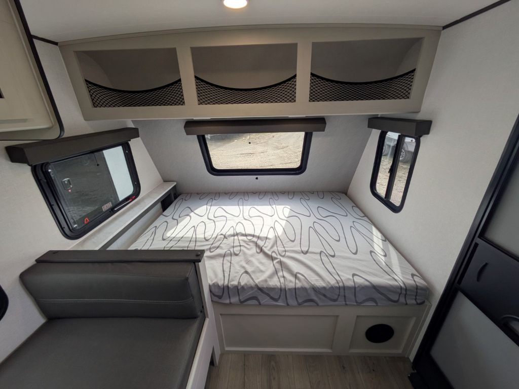 Step inside and you’ll immediately appreciate the thoughtful layout that maximizes living space in a compact footprint. Up front, a comfortable full-size bed gives you a cozy place to rest, while the rear corner bunk area provides sleeping space that’s ideal for kids, guests or extra storage when needed. The booth dinette not only offers a great spot for shared meals, it also converts into additional sleeping space, making it easy to accommodate more people without feeling crowded.