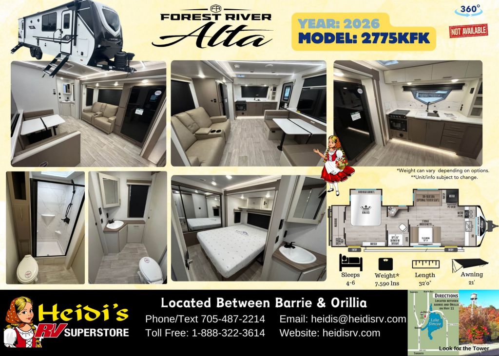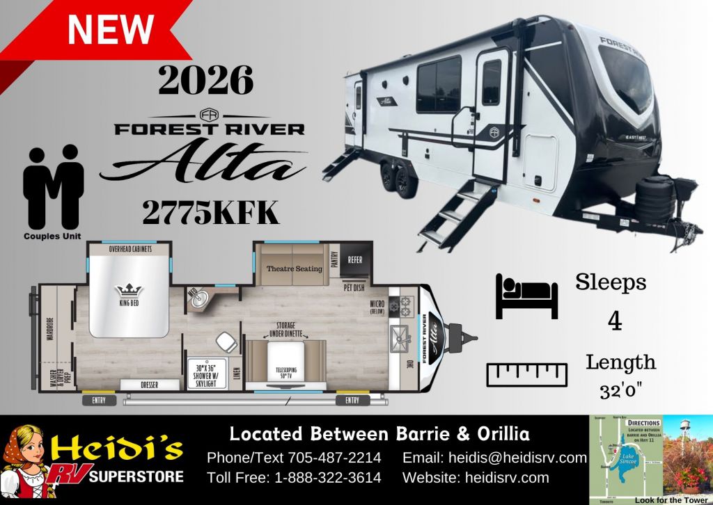 Discover Your Ideal RV at Heidi's RV Superstore, Proudly Serving Simcoe County ("Cottage Country"), including Barrie, Orillia, Innisfil, Collingwood, Wasaga Beach, and Beyond. Conveniently located ~1 hr North of Toronto on Hwy 11 in Oro-Medonte. Explore our extensive inventory online at www.heidisrv.com or Call Toll-Free 1-888-322-3614 for Expert Assistance