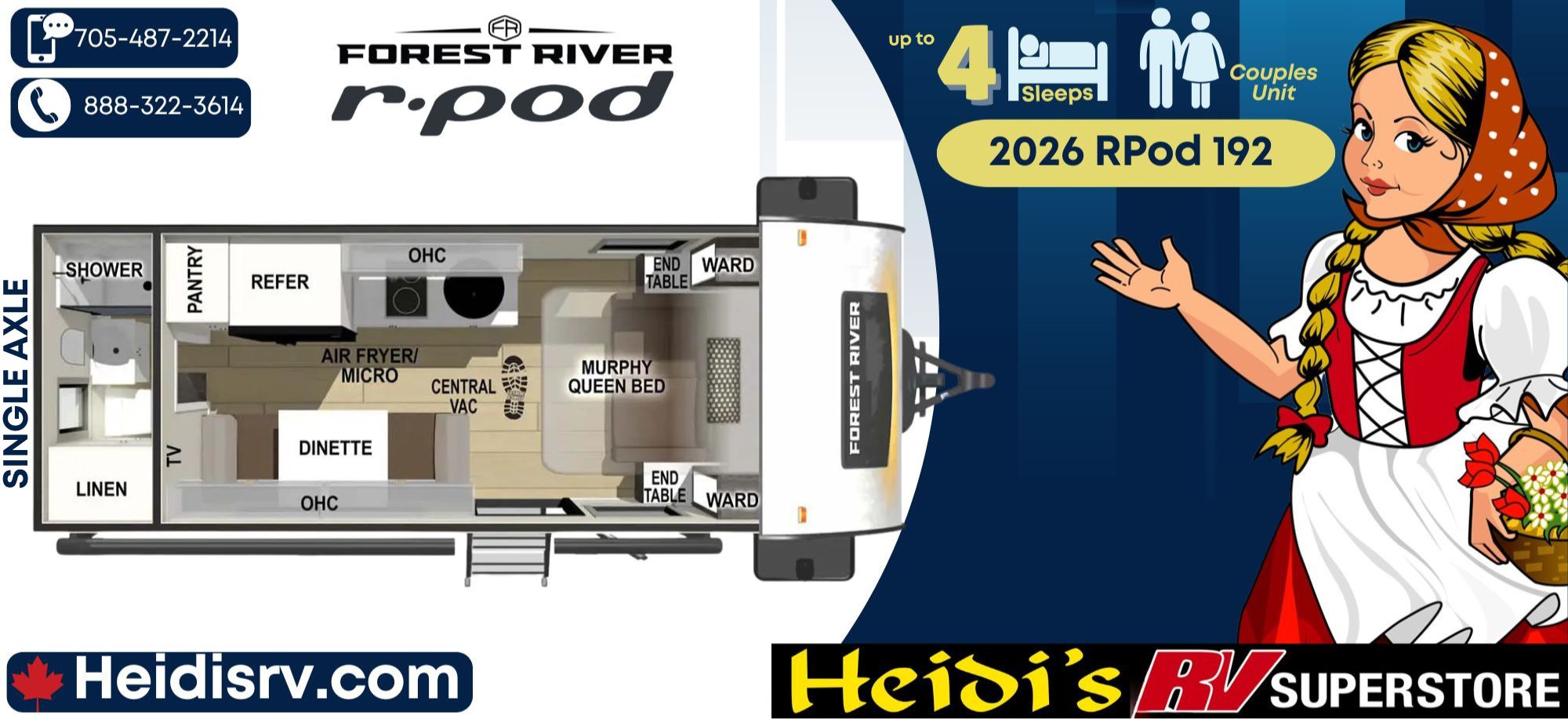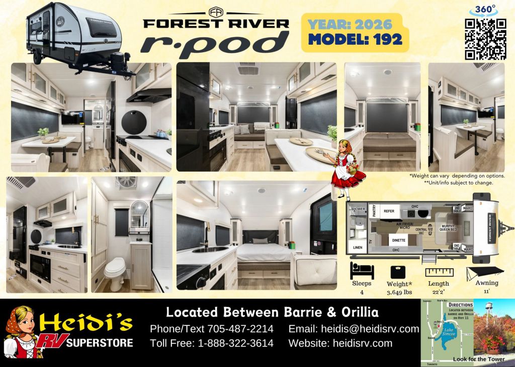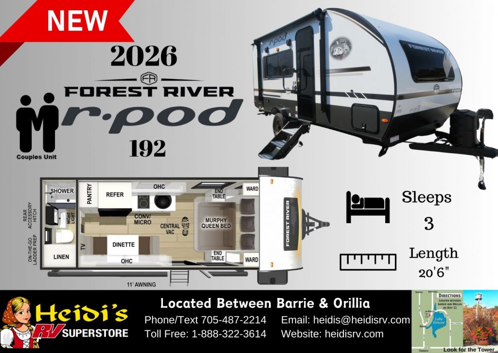Discover Your Ideal RV at Heidi's RV Superstore, Proudly Serving Simcoe County ("Cottage Country"), including Barrie, Orillia, Innisfil, Collingwood, Wasaga Beach, and Beyond. Conveniently located ~1 hr North of Toronto on Hwy 11 in Oro-Medonte. Explore our extensive inventory online at www.heidisrv.com or Call Toll-Free 1-888-322-3614 for Expert Assistance