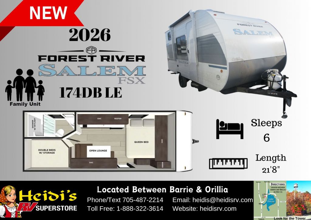 Discover Your Ideal RV at Heidi's RV Superstore, Proudly Serving Simcoe County ("Cottage Country"), including Barrie, Orillia, Innisfil, Collingwood, Wasaga Beach, and Beyond. Conveniently located ~1 hr North of Toronto on Hwy 11 in Oro-Medonte. Explore our extensive inventory online at www.heidisrv.com or Call Toll-Free 1-888-322-3614 for Expert Assistance