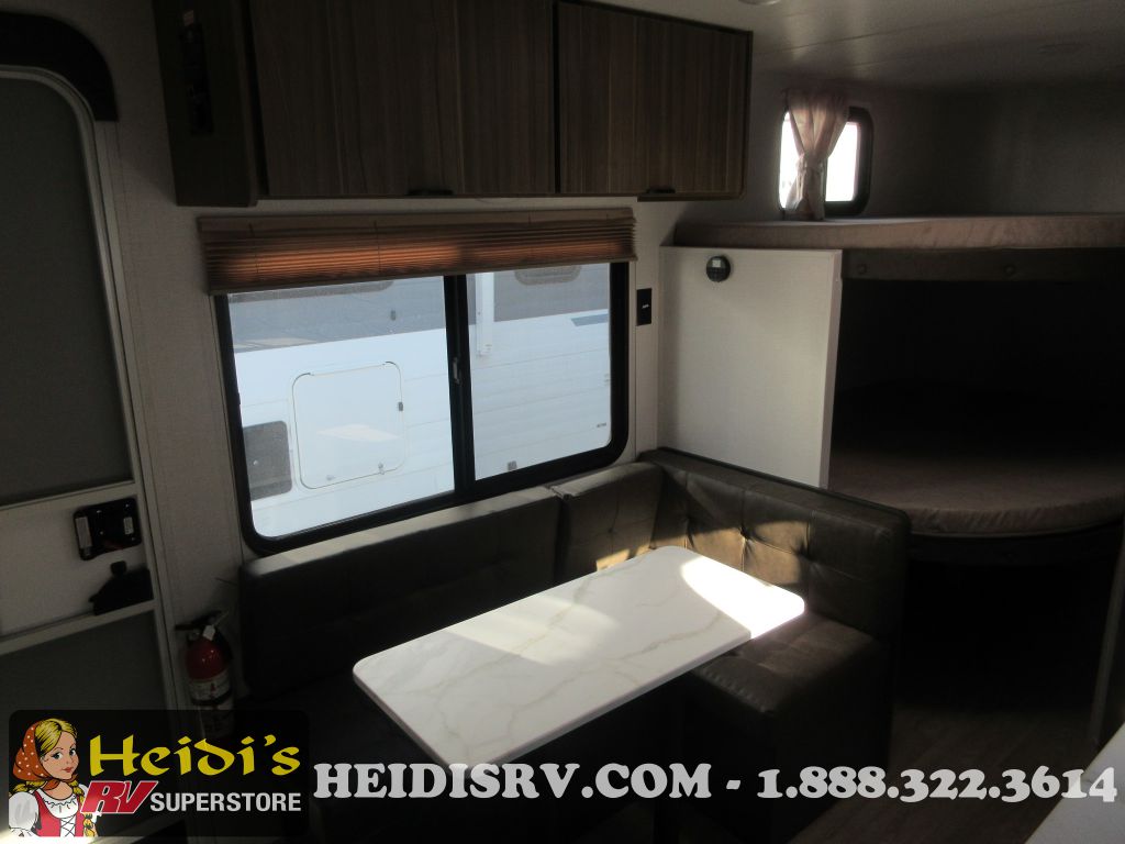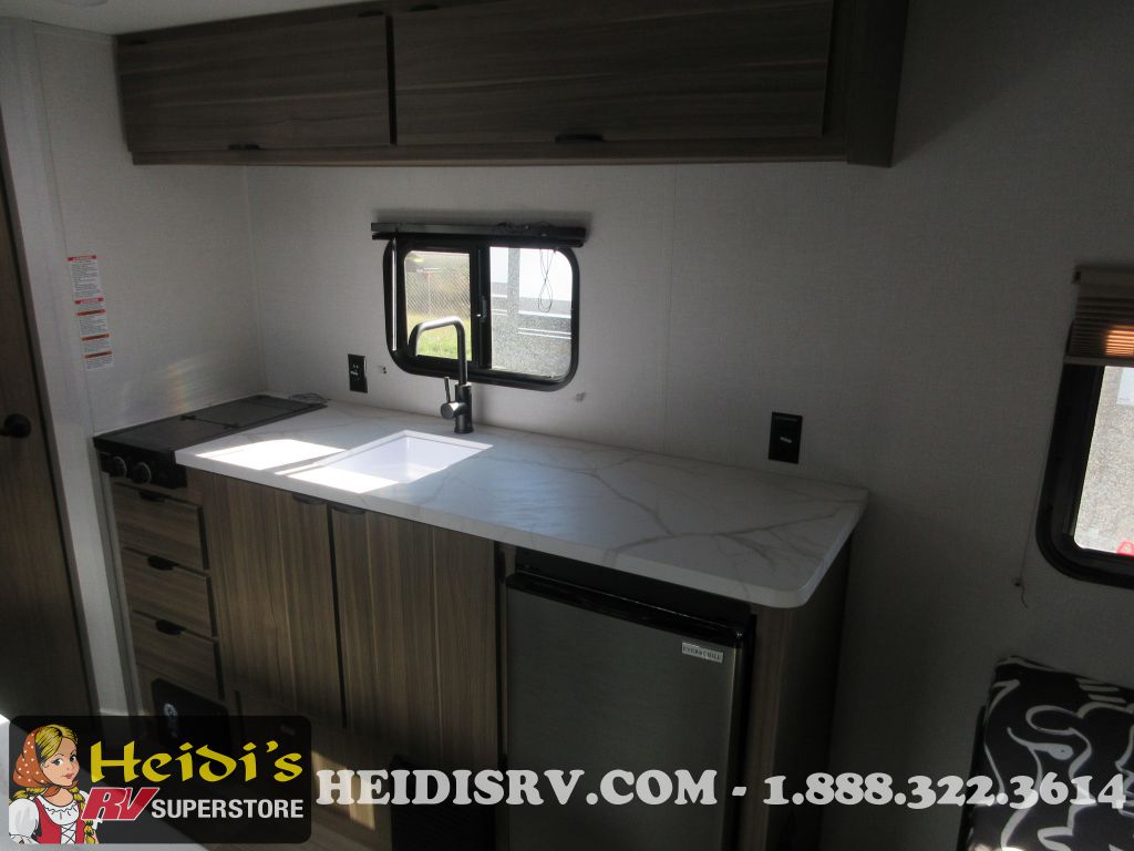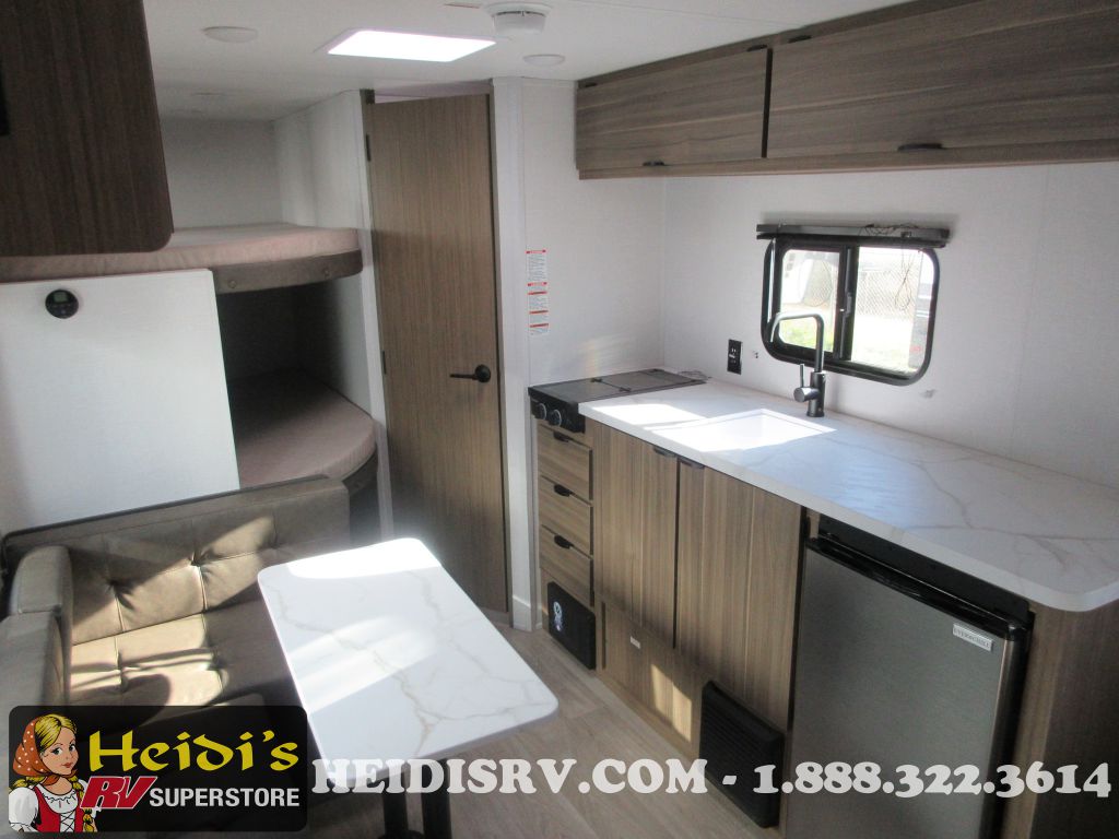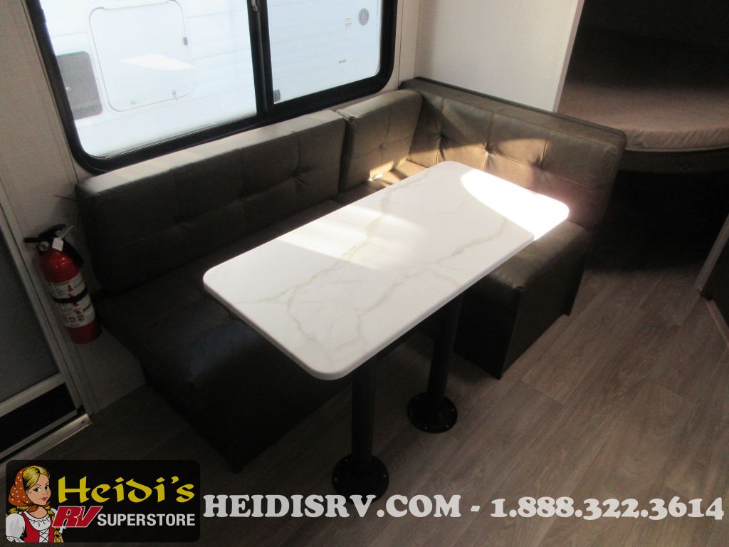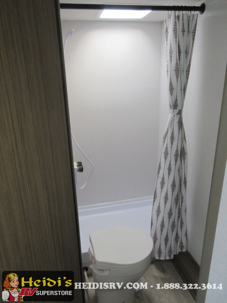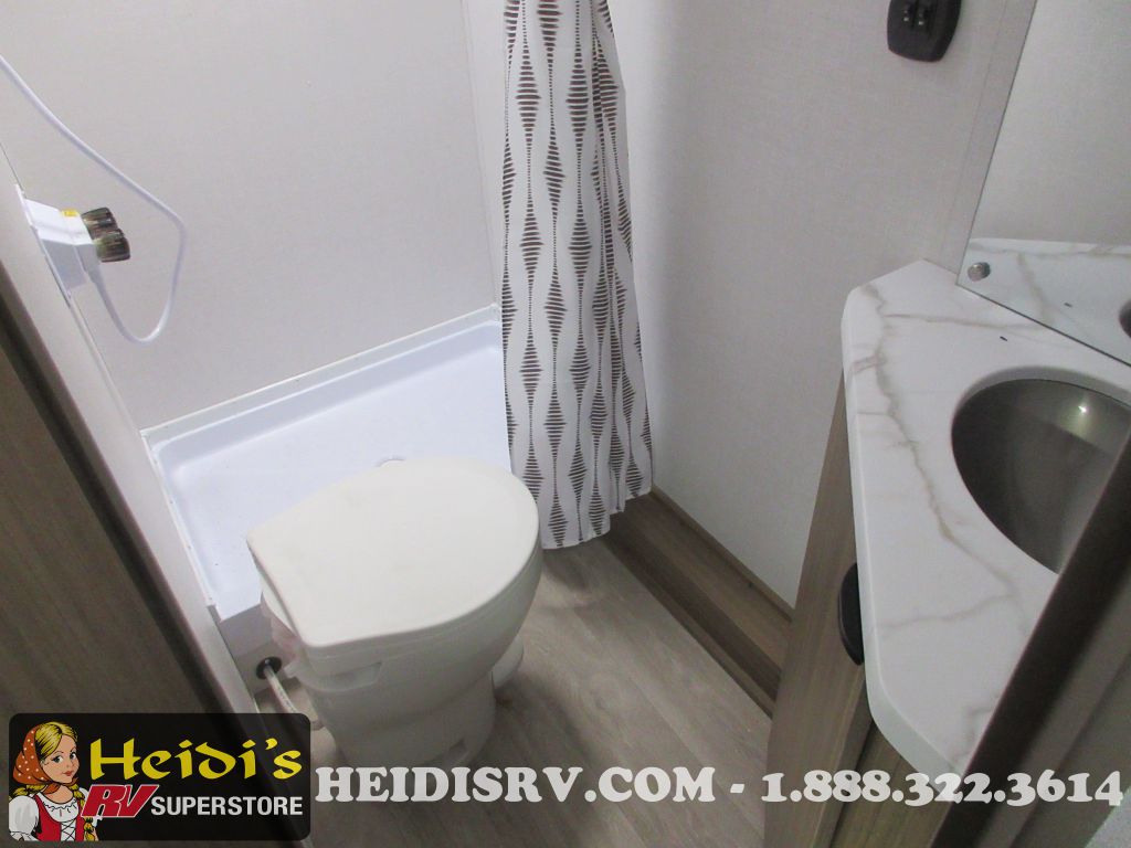 Enjoy the convenience of a private shower and toilet for daily refreshment. The kitchen is equipped with a two-burner cooktop, perfect for preparing delicious meals on the go. Stay cozy with the 5,000 BTU fireplace, and keep cool during summer with the 13,500 BTU roof-mounted A/C. The DSI water heater ensures you have hot water whenever you need it.