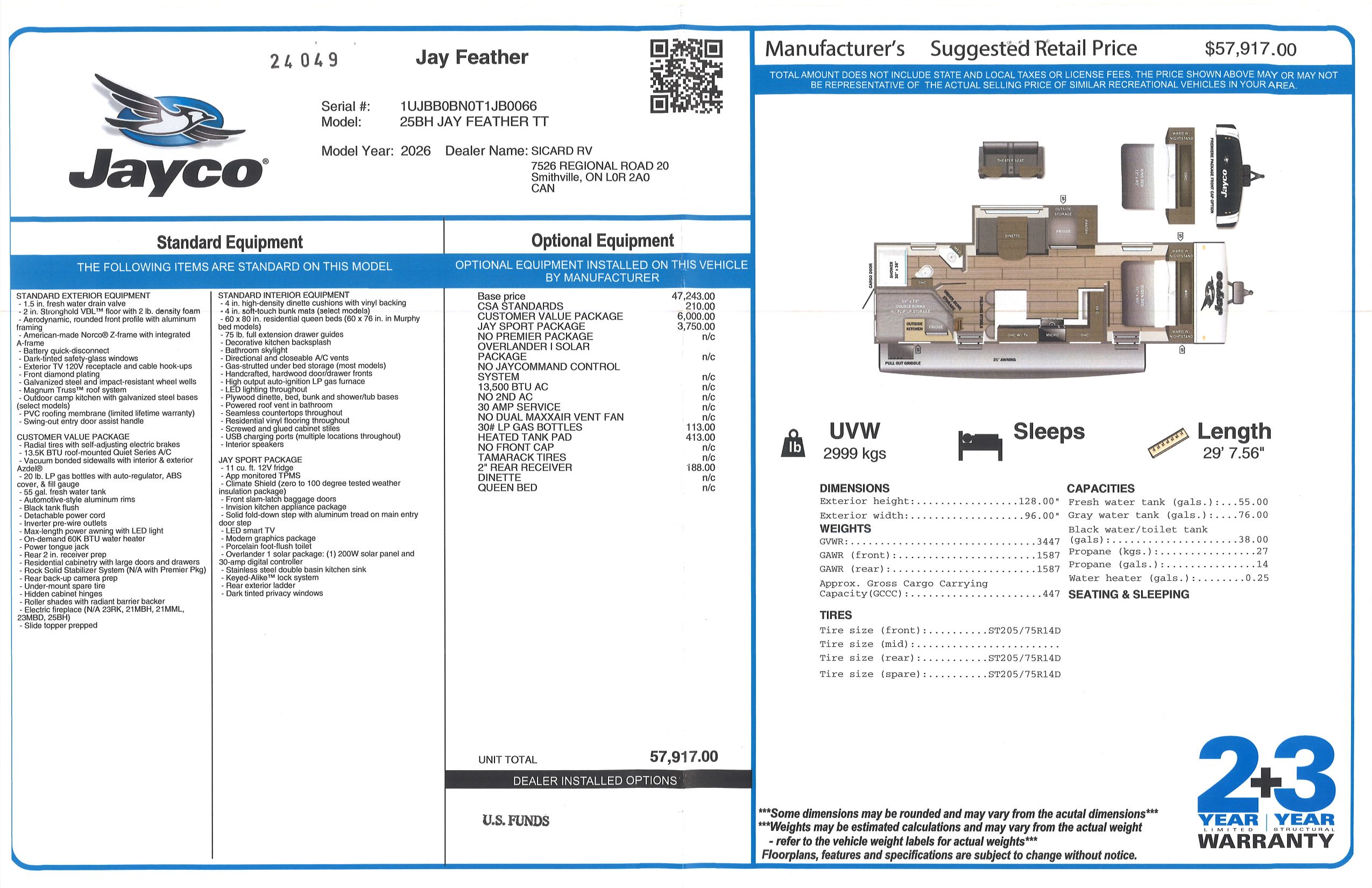 Inside this Jay Feather 25BH, you will find double bunk beds that give you plenty of extra sleeping space. Included with this Jay Feather 25BH, you will also receive the JaySport Package option. All Jay Feathers come with a 2 year limited warranty and a 3 year structural warranty, providing you with peace of mind against any defects.