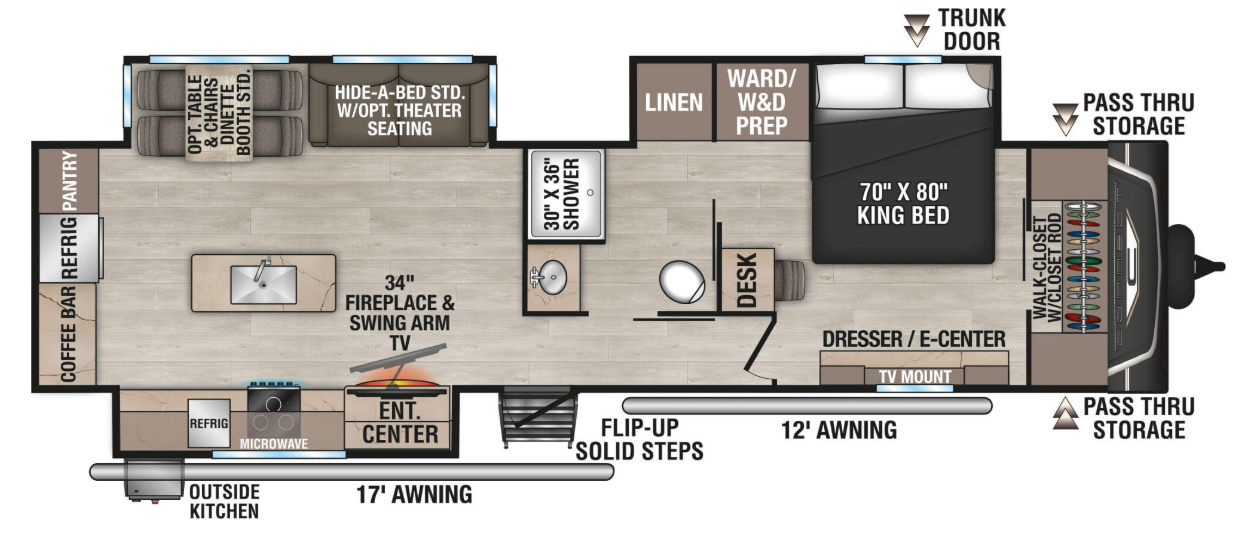 - KZ Engage: Powered By OneControl (monitors: battery levels, controls: slide rooms, leveling system, awning(s), inside/outside lighting, TPMS Prep)