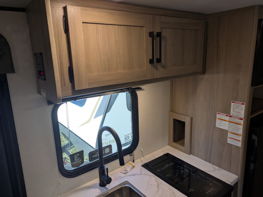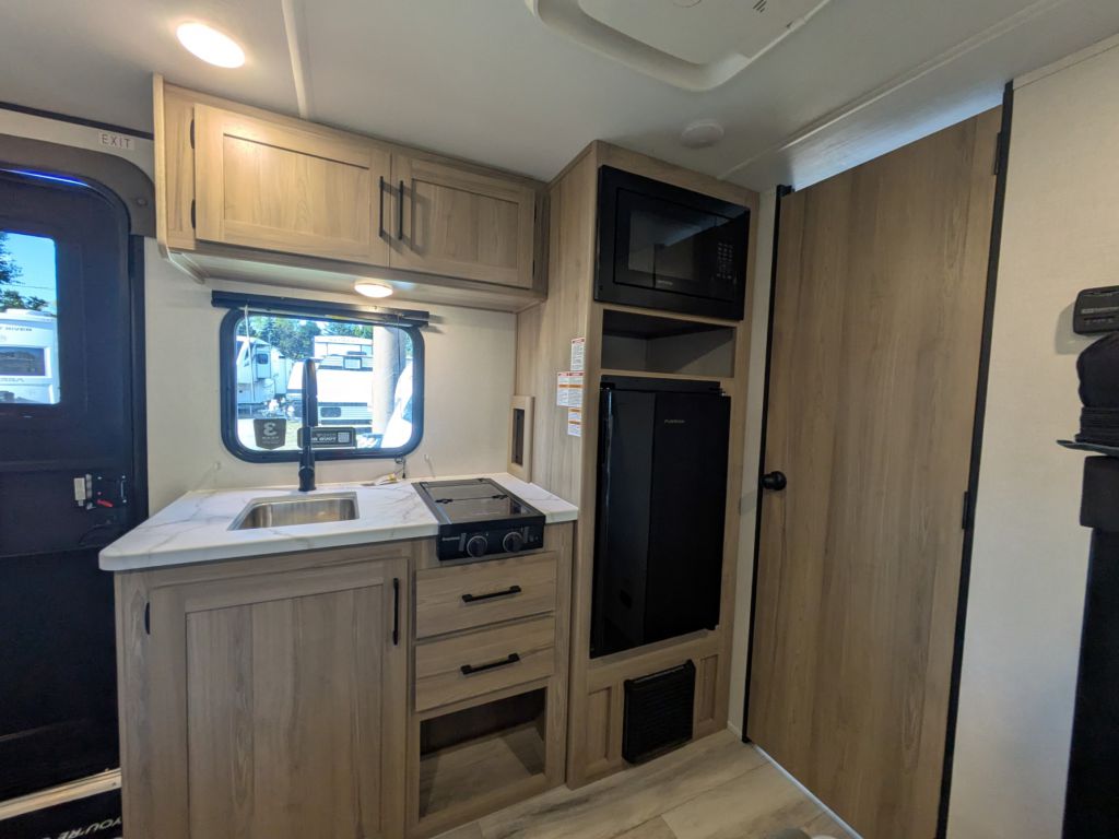 Kitchen Amenities: Equipped with a 3.3 cu. ft. refrigerator, two-burner cooktop, microwave, and a high-rise kitchen faucet for easy meal preparation.
