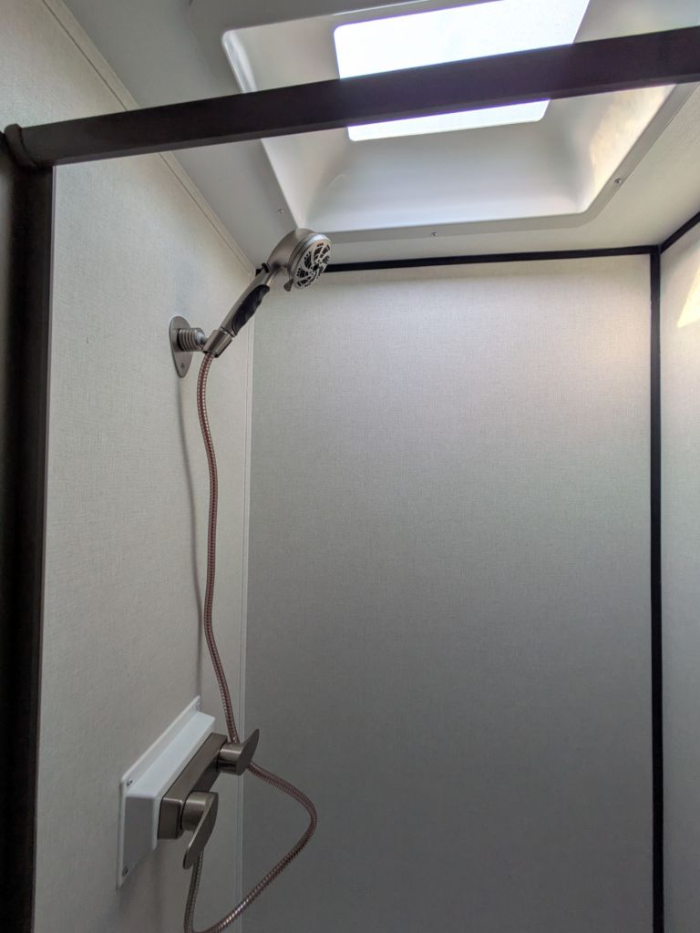 Bathroom Facilities: Includes a foot-flush toilet and a shower with a skylight, providing natural light and added headroom.