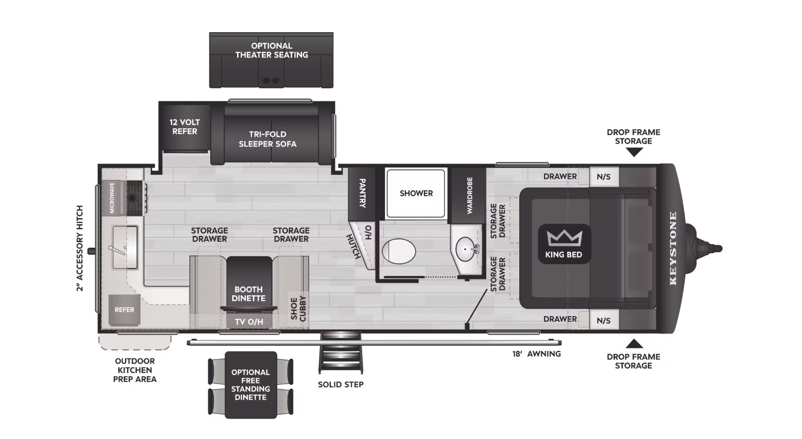 Underneath the 25MLE you’ll find a custom-engineered I-beam chassis with stamped steel cross-members and outriggers. This foundation supports a drop-frame construction that creates a large front storage compartment without increasing profile or compromising balance. Hitching up is simplified thanks to a power tongue jack with 3,500 lb lift and hitch light, while heavy-duty 4,400 lb axles with ABS brakes ride on Goodyear Endurance 10-ply E-rated tires. A full-size spare is included, and a 2-inch rear accessory receiver rated for 300 lb adds versatility for bikes, cargo carriers or extra gear.
