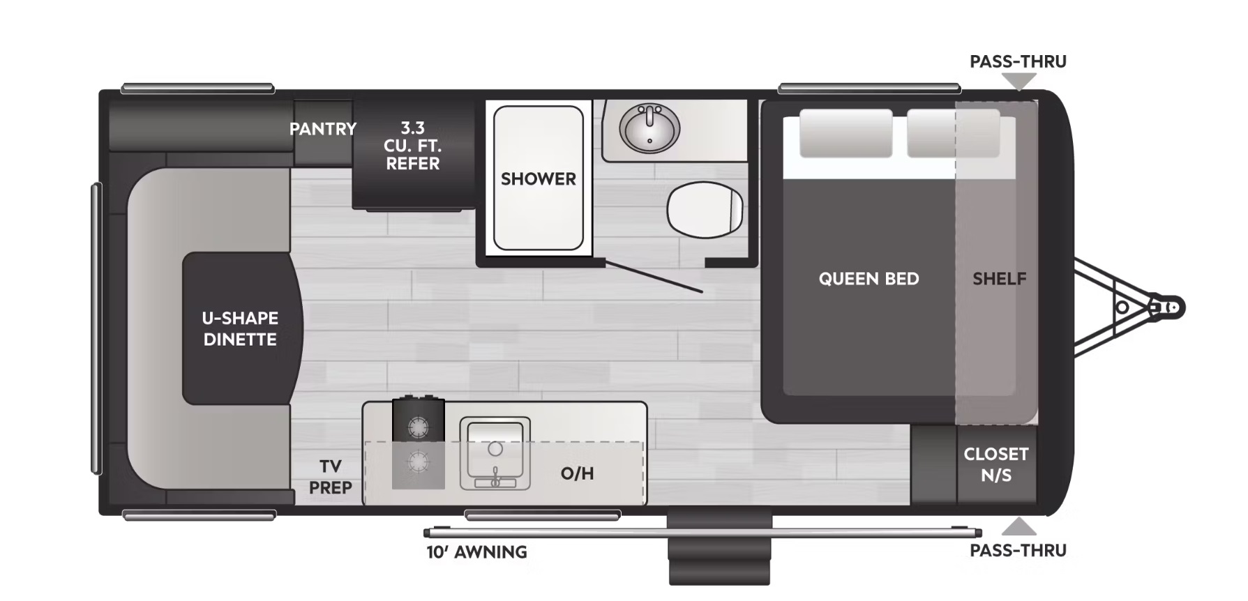 Well-Designed Sleeping Area With a comfortable queen bed, this Hideout camper ensures a restful night’s sleep after a day of exploration. The sleeping area is designed with ample headroom and storage to help you unwind and recharge, making it perfect for solo travelers, couples, or families on short trips.