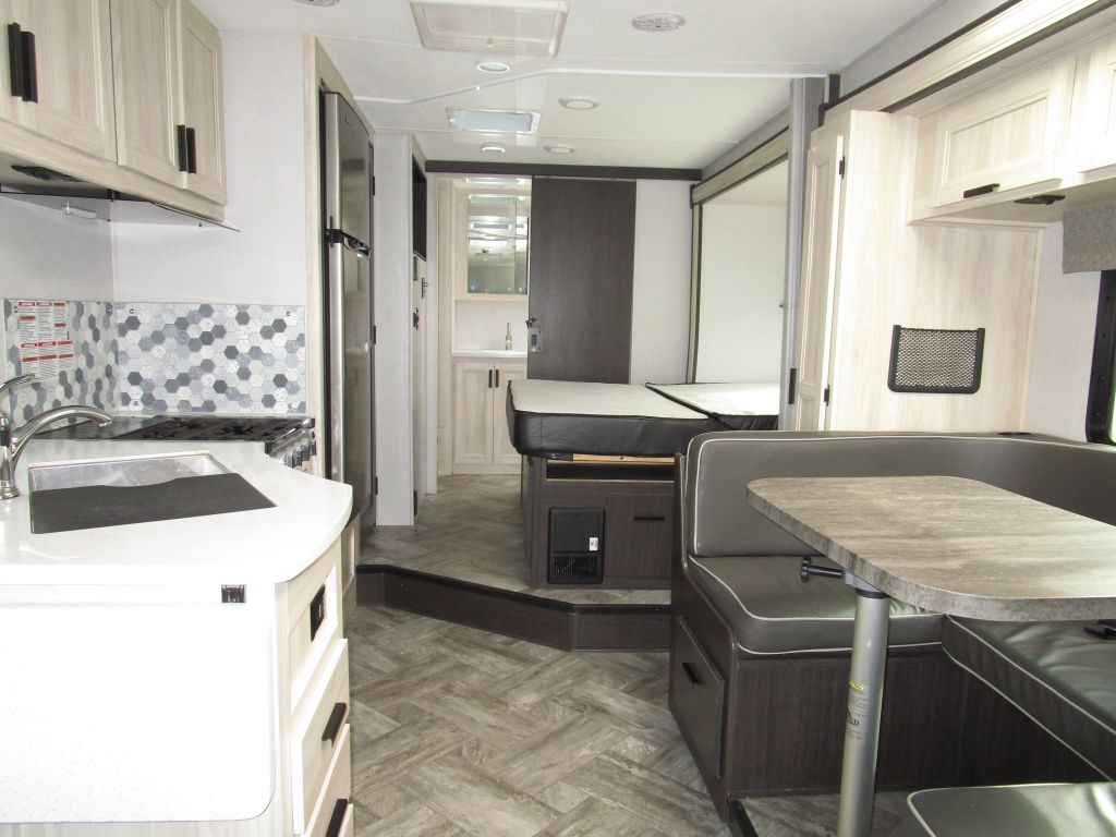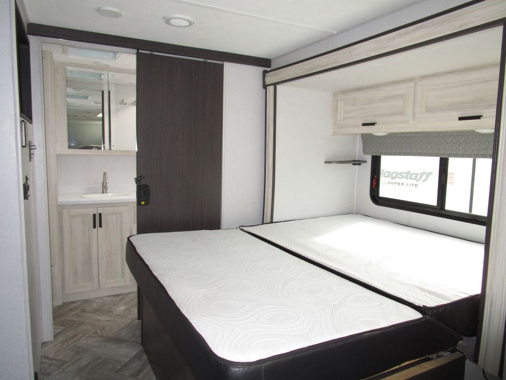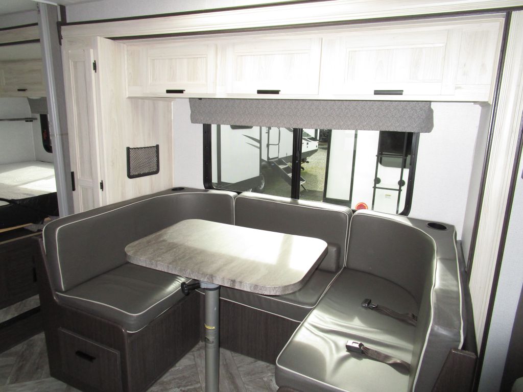 Sleeps 4-6: Queen-size rear bed, a dinette that converts to a second bed, and a spacious cab-over bunk with dual windows.