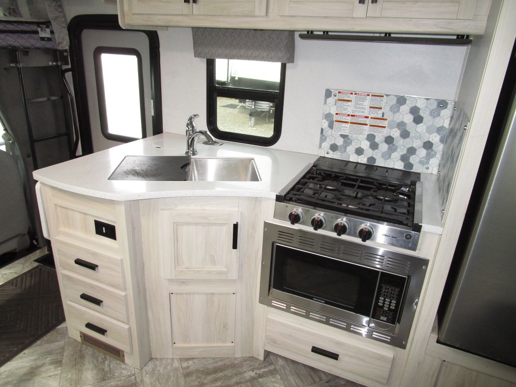 Chef’s Kitchen: Sealed burner range, flip-up counter extension, and upgraded soft-close drawer glides.