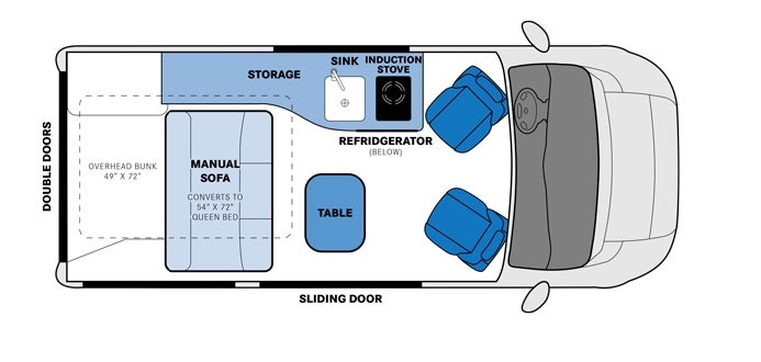 - Manual Fold Down Rear Seat for Bed Configuration (54" X 72")