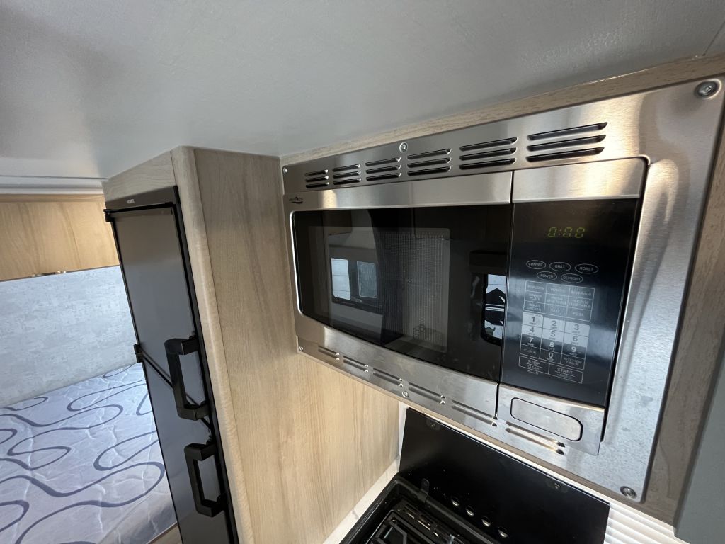 - Kitchen includes fridge/freezer, convection microwave and stove top with cover