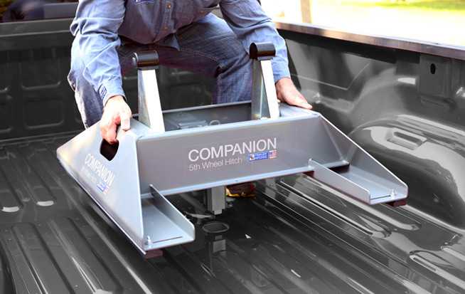 Staying true to our mission of designing hitches that allow truck owners to use their truck when not towing, we created the Companion fifth-wheel hitch. Most conventional fifth-wheel hitches us an in-the-bed rail system, but these rails prove to be unwieldy. The Companion utilizes an under-bed mounting system. Therefore, only a 4” hole is required in the truck bed, and users can easily remove the Companion completely from the bed, leaving it level for other uses.